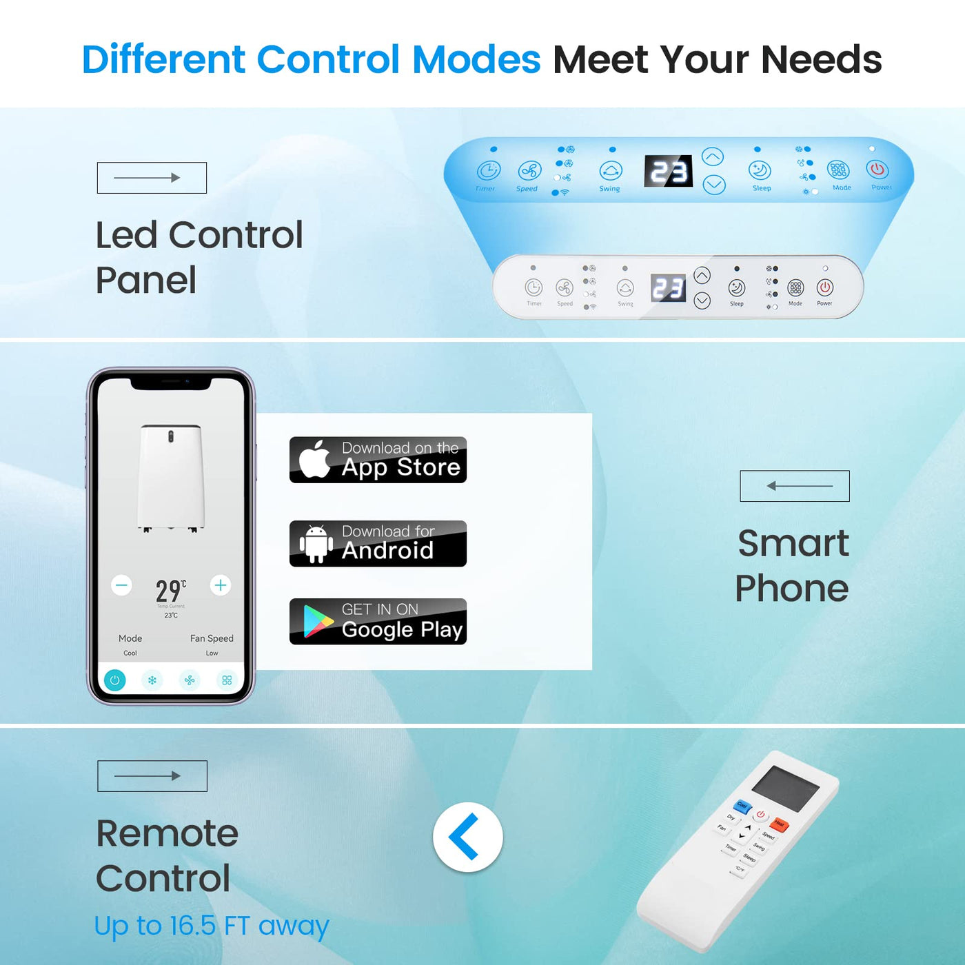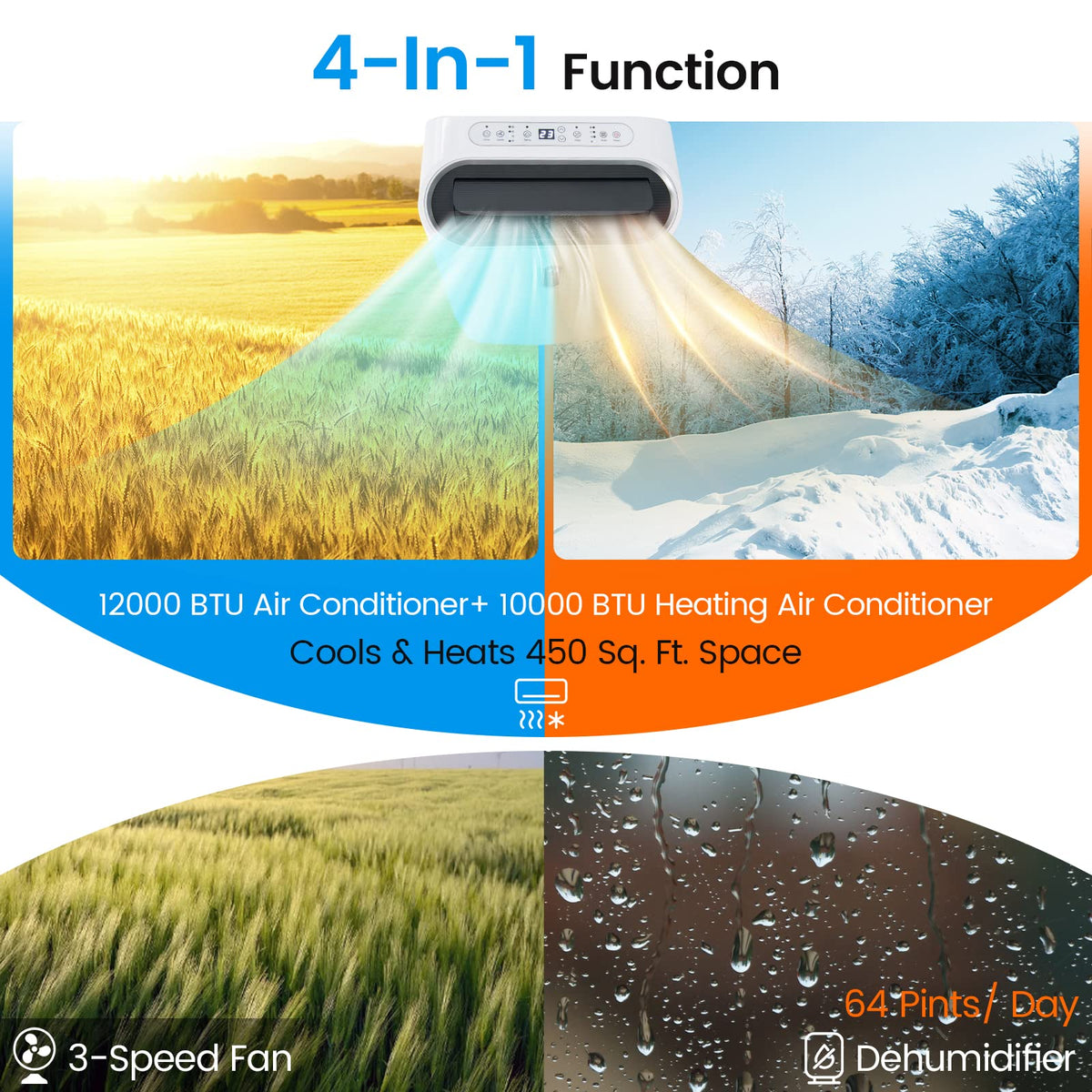 Description: Experience Optimal Comfort With Our Powerful 12000 Btu Air Conditioner, Providing Cooling And Heating For Spaces Up To 450 Sq.Ft. Control The Temperature, Timer, Modes, And More Effortlessly Through The Led Panel, Included Remote Control, Or Mobile App Compatibility For Android And Ios. Features: Powerful Cooling & Heating: 12000 Btu Unit For 450 Sq.Ft Space With Dehumidifier And 3-Speed Fan Convenient Control Options: Led Panel, Remote Control, And Mobile App For Easy Operation Sleep Mode & Timer: Quiet Operation In Sleep Mode With 24H Timer For Energy Efficiency Customizable Airflow: 3 Speed Settings And 70 Auto Swing For Personalized Comfort Efficient Drainage System: Self-Evaporating Design, Drain Plug, And Drainpipe For Easy Maintenance Easy Installation & Portability: Complete Window Kit, Suitable For Horizontal And Vertical Windows, With 4 Universal Casters For Effortless Movement Specifications: Color: White Material: Abs Sizes: 17.5'' X 15.5'' X 31''(L X W X H) Cooling Capacity: 12000 Btu Heating Capacity: 10000 Btu Coverage Area: 450 Sq. Ft. Air Flow Rate: 410 M/H Temperature Range: 60.8?~89.6? Dehumidification Capacity: 64 Pints/Day Voltage: 115V/60Hz Exhaust Hose Length: 0.8 Ft- 5 Ft Drainage Pipe Length: 25.5'' Window Size: 25.5''-47'' Net Weight: 65 Lbs
