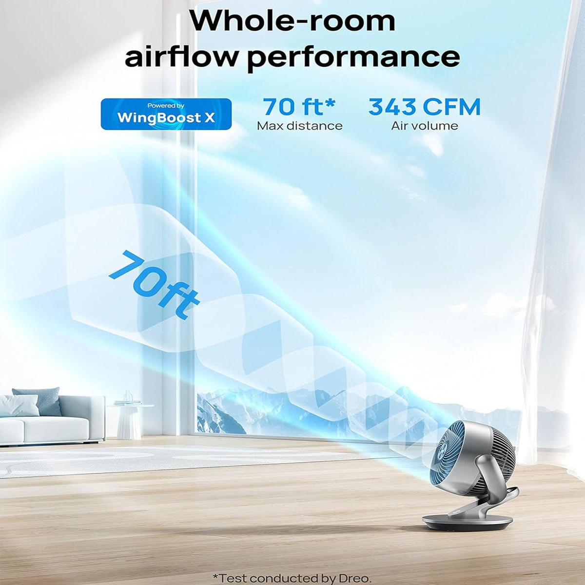 Q: What is the maximum airflow distance of the Dreo Smart Fan?A: The Dreo Smart Fan can deliver powerful airflow up to 70 feet, thanks to its innovative WingBoost technology, making it ideal for whole-room air circulation.