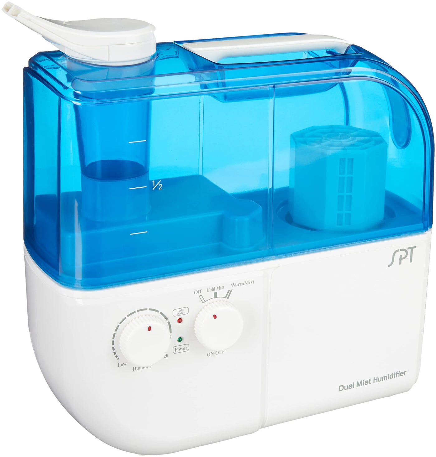 Effectively Relieve Dry Nose, Throat Lips And Itchy Skin With The Virtually Silent Dual Mist Humidifier With Ion Exchange Filter. Will Help You Breathe Easier And Sleep More Comfortably. This Ultrasonic Humidifier Disperses Warm Or Cool Mist. A Split Nozzle For Bi-Directional Mist For Wider Coverage. Sleek Design With Easy To Use Control Knobs. Large, Transparent Blue Water Tank With Easy-Carrying Handle