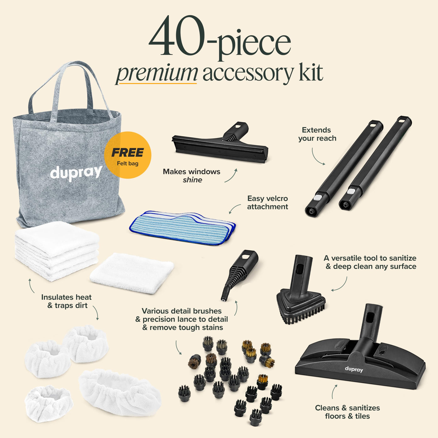Elevate Your Cleaning Game With The Dupray Neat Steam Cleaner, Now Paired With A Comprehensive 40-Piece Accessory Kit. Designed For Ultimate Versatility And Efficiency, This Complete Cleaning Solution Is Perfect For Tackling A Wide Range Of Cleaning Tasks, Both Large And Small. Why Choose Dupray Neat + Multi-Accessories (40 Pieces)? Comprehensive Cleaning Kit: Our 40-Piece Accessory Set Includes Everything You Need To Clean, Sanitize, And Refresh Every Corner Of Your Home. From Floors And Carpets To Kitchen Appliances, Bathroom Tiles, And Even Your Car Interior, This Kit Has You Covered. Multi-Purpose Use: Whether You'Re Scrubbing Away Grime In The Bathroom, Removing Grease In The Kitchen, Or Detailing Your Car, The Dupray Neat Steam Cleaner And Its Versatile Accessories Make It Easy To Get The Job Done. Chemical-Free Cleaning: Harness The Power Of Steam To Clean And Sanitize Without The Use Of Harsh Chemicals. Safe For Your Family, Pets, And The Environment, This Steam Cleaner Provides A Natural Solution To Deep Cleaning. Wide Range Of Attachments: The Kit Includes Various Brushes, Nozzles, Microfiber Pads, Extension Tubes, And More, Each Designed For Specific Cleaning Tasks. Tackle Delicate Surfaces, Hard-To-Reach Areas, And Heavy-Duty Cleaning With Ease. Easy To Use: Attachments Are Easy To Swap Out, Allowing You To Transition Seamlessly Between Tasks And Surfaces. The Lightweight Design And Easy Maneuverability Of The Dupray Neat Steam Cleaner Make Your Cleaning Experience Efficient And Enjoyable. Upgrade Your Cleaning Routine With The Dupray Neat Steam Cleaner + Multi-Accessories (40 Pieces). Order Yours Today And Discover The Ultimate In Steam Cleaning Versatility!