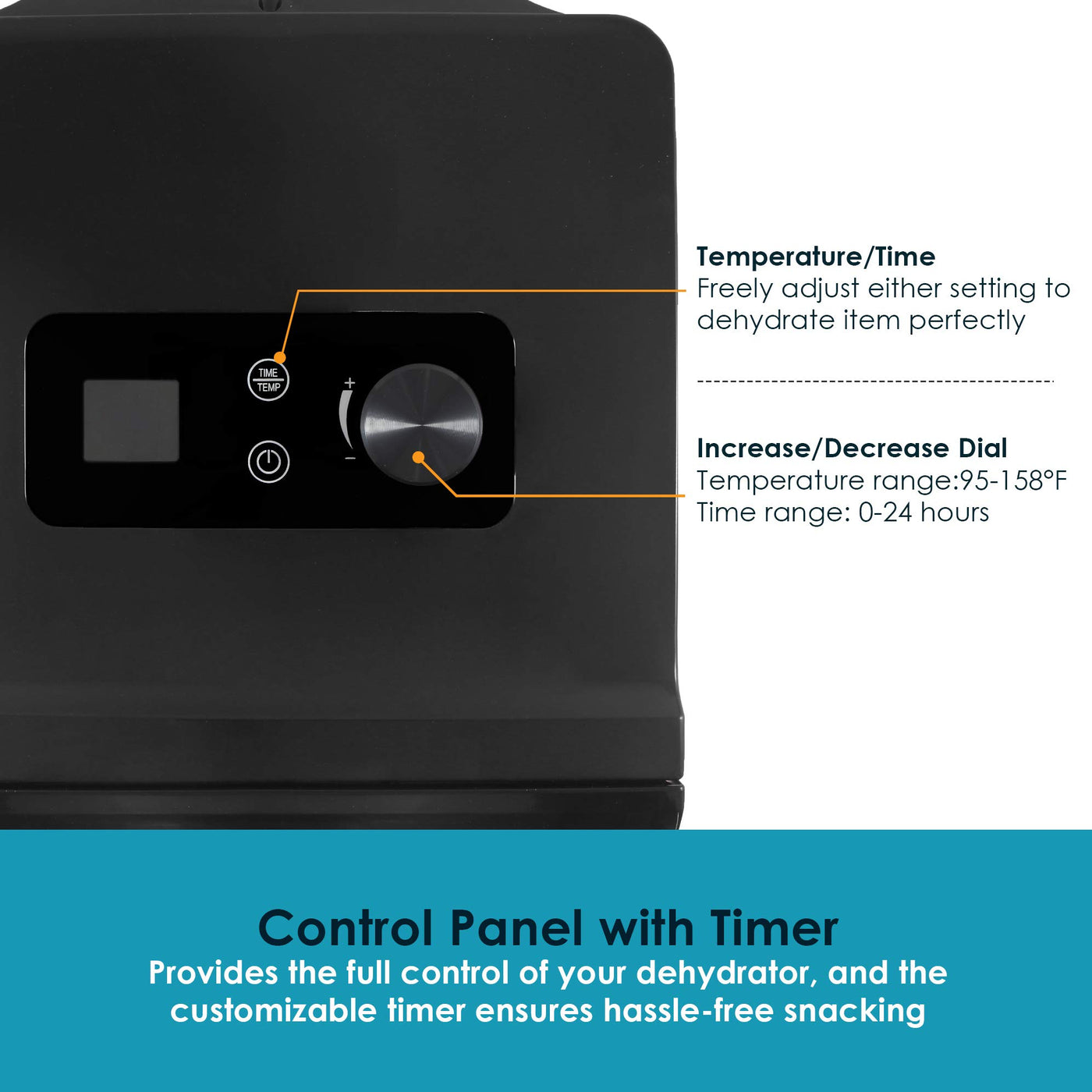 Q: How does the adjustable temperature control work on this dehydrator?A: The dehydrator features adjustable temperature controls ranging from 95ºF to 158ºF, allowing you to set the optimal temperature for different foods. This ensures that your snacks are dehydrated evenly and efficiently.