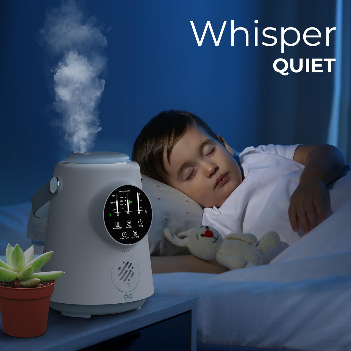 Q: Is the humidifier safe to use in a child's room?A: Yes, the Upgraded 2.5L Top Fill Humidifier is safe for use in a child's room. It includes a child lock feature to prevent accidental adjustments and an anti dry-burn atomizer that ensures safe operation. Additionally, it has an auto-stop function that activates when the water tank is removed.