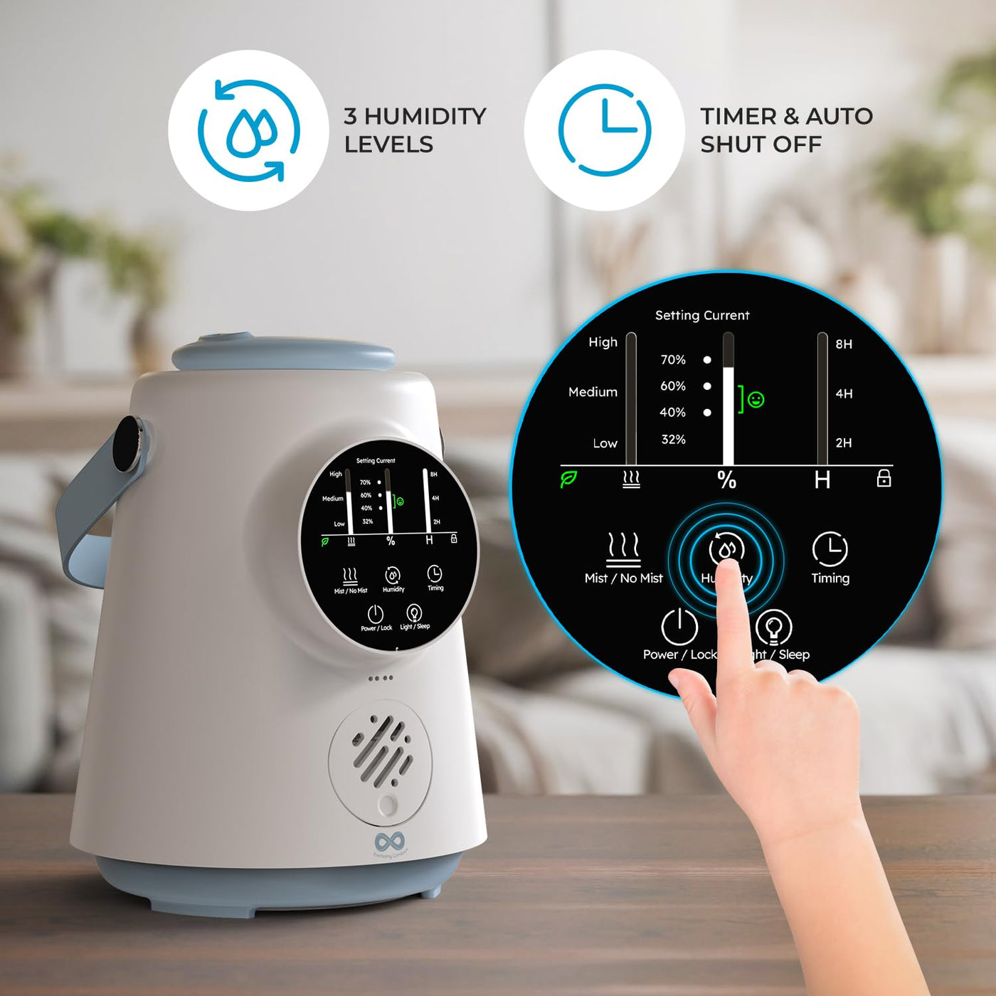 Q: How does the timer function work on this humidifier?A: The timer function on the humidifier allows you to set it to run for 2, 4, or 8 hours. This feature is designed to save energy and provide convenience, ensuring you can enjoy moisturized air without the need to manually turn it off.