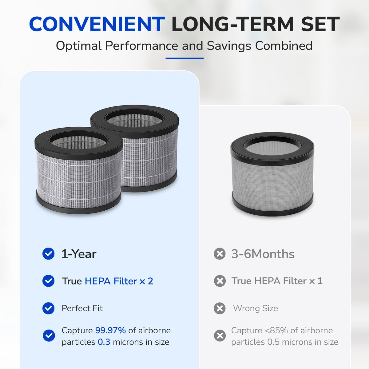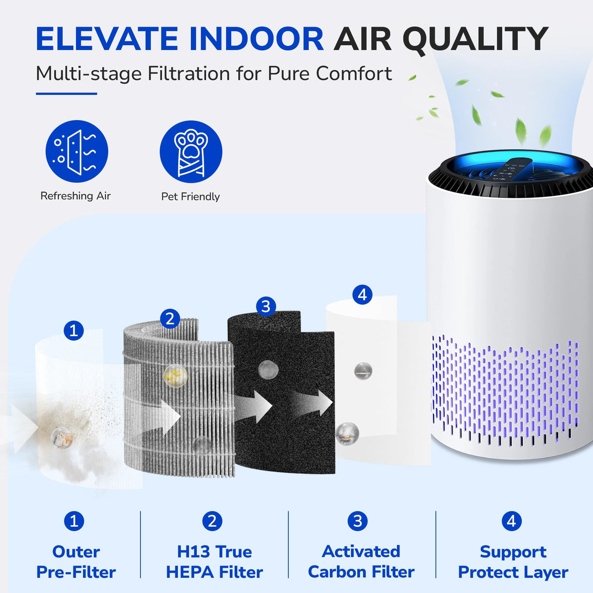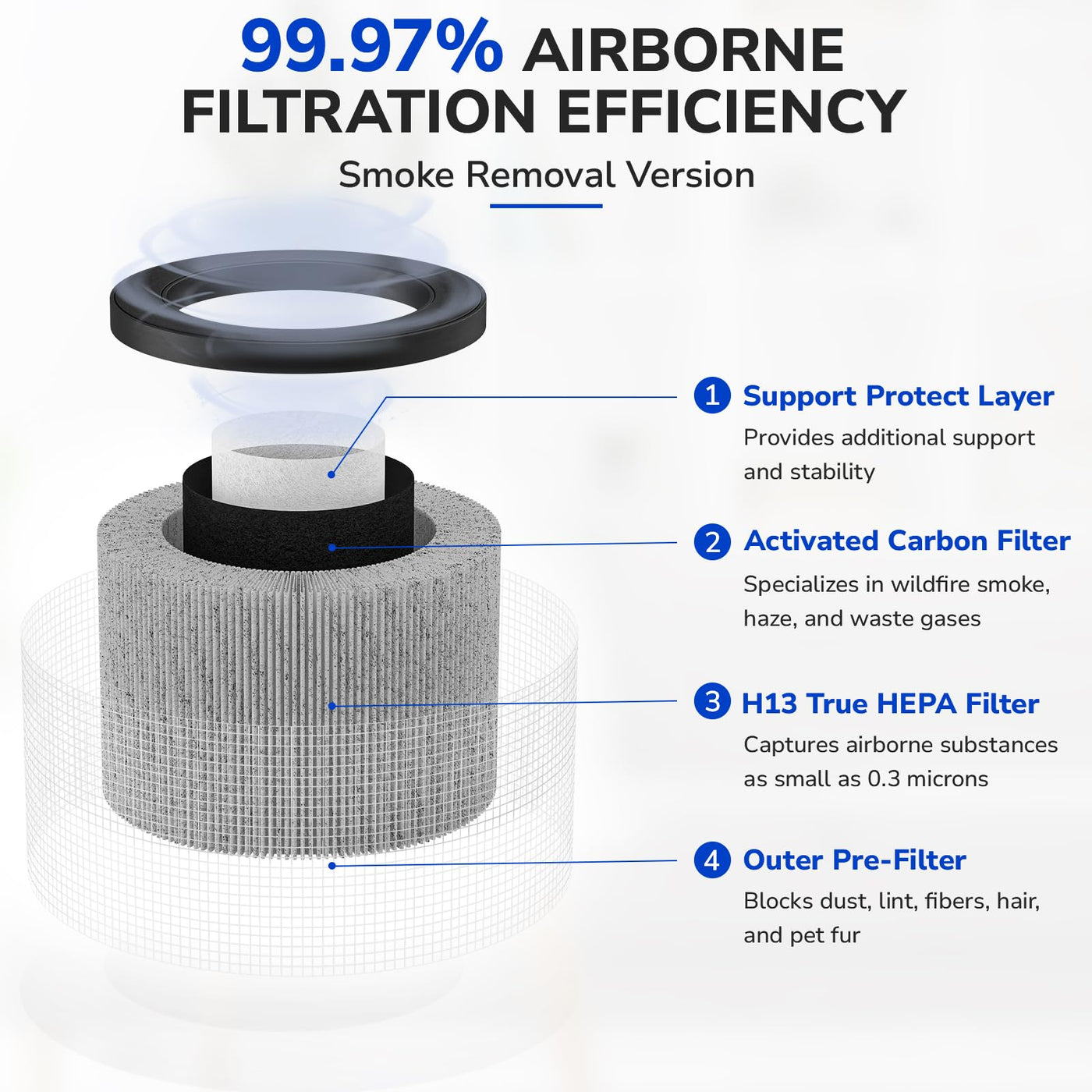 Q: What type of filtration system do these replacement filters use?A: The Fil-fresh filters utilize a 4-in-1 filtration system, including an Outer Preliminary Filter, H13 True HEPA Filter, Gas Phase Filtration Media Layer, and a Protect Support Layer, effectively capturing 99.97% of airborne particles as small as 0.3 microns.