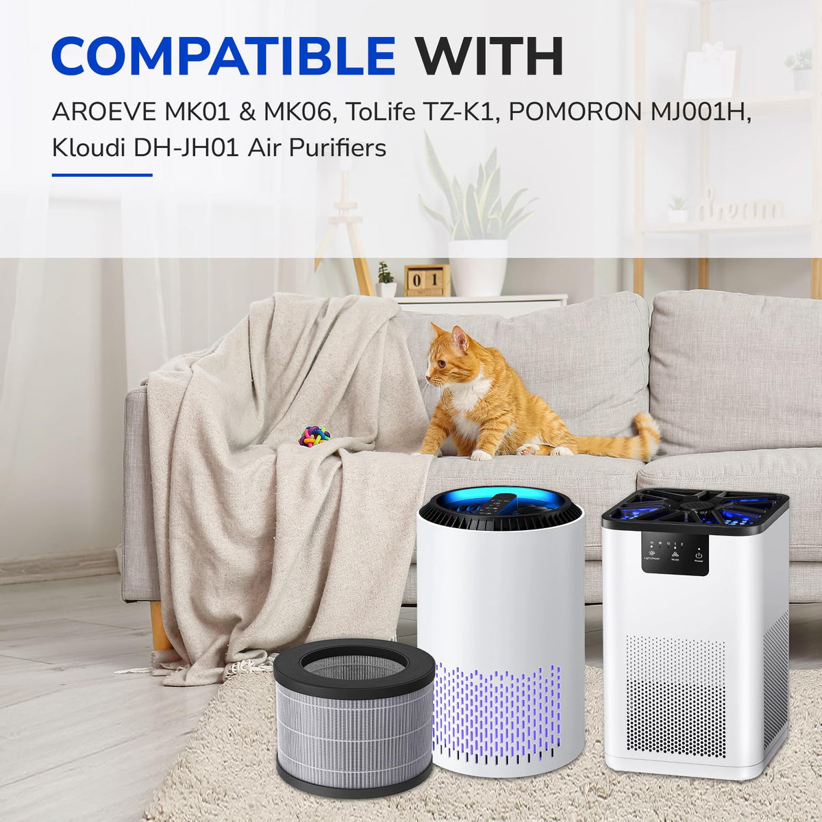 Q: What air purifiers are compatible with the Fil-fresh MK01 & MK06 replacement filters?A: The Fil-fresh MK01 & MK06 replacement filters are compatible with AROEVE MK01 & MK06, ToLife TZ-K1, POMORON MJ001H, Kloudi DH-JH01, Intelabe EPI080/EP1080, and Elechomes EPI081/EP1081 air purifiers.
