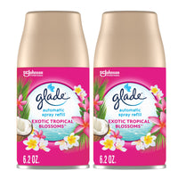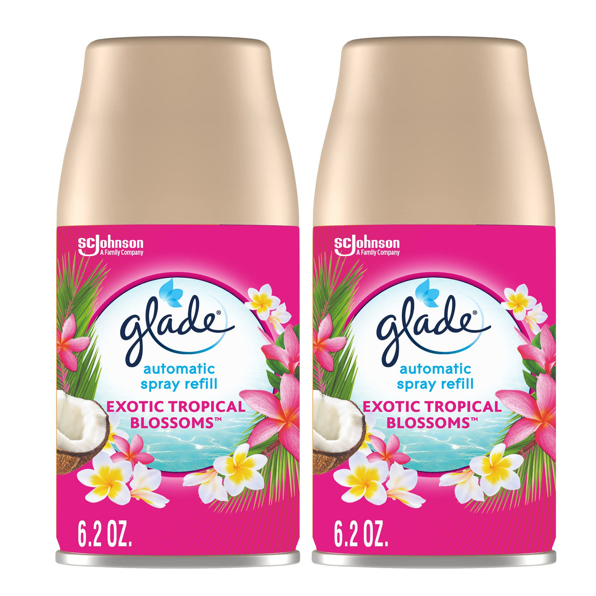 Q: What scents are available for the Glade Automatic Spray Refill?A: The Glade Automatic Spray Refill is available in various scents, including the Exotic Tropical Blossoms, which features notes of monoi blossoms, melon, and coconut milk, crafted by master perfumers for a delightful aromatic experience.
