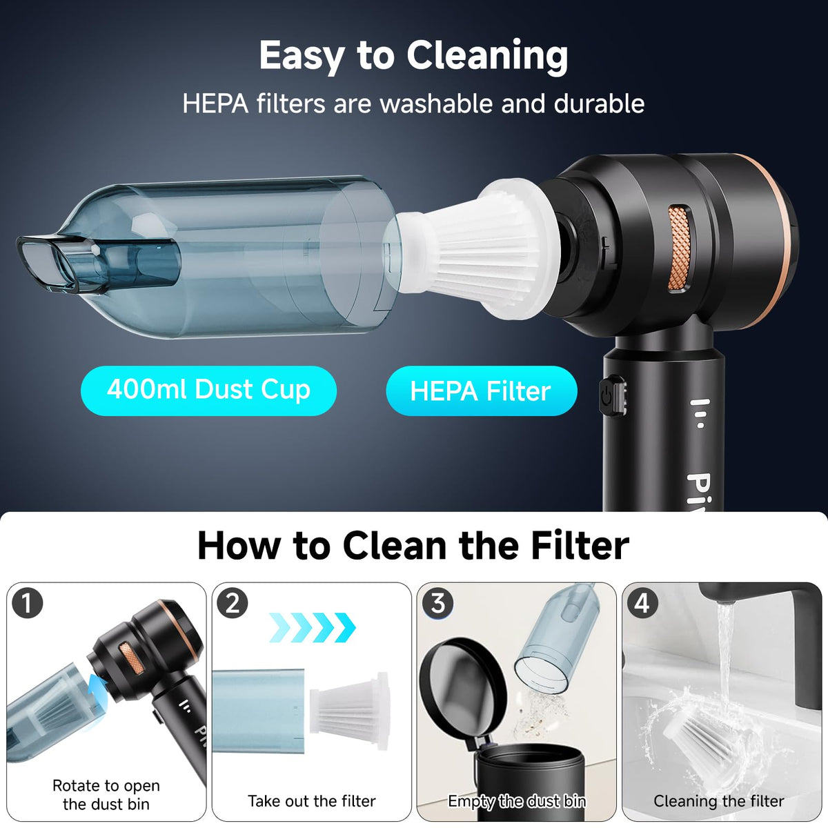 Q: Is the HEPA filter reusable, and how do I clean it?A: Yes, the vacuum comes with a reusable and washable HEPA filter. It can be easily removed, washed, and reused, ensuring effective filtration of fine dust while being environmentally friendly.