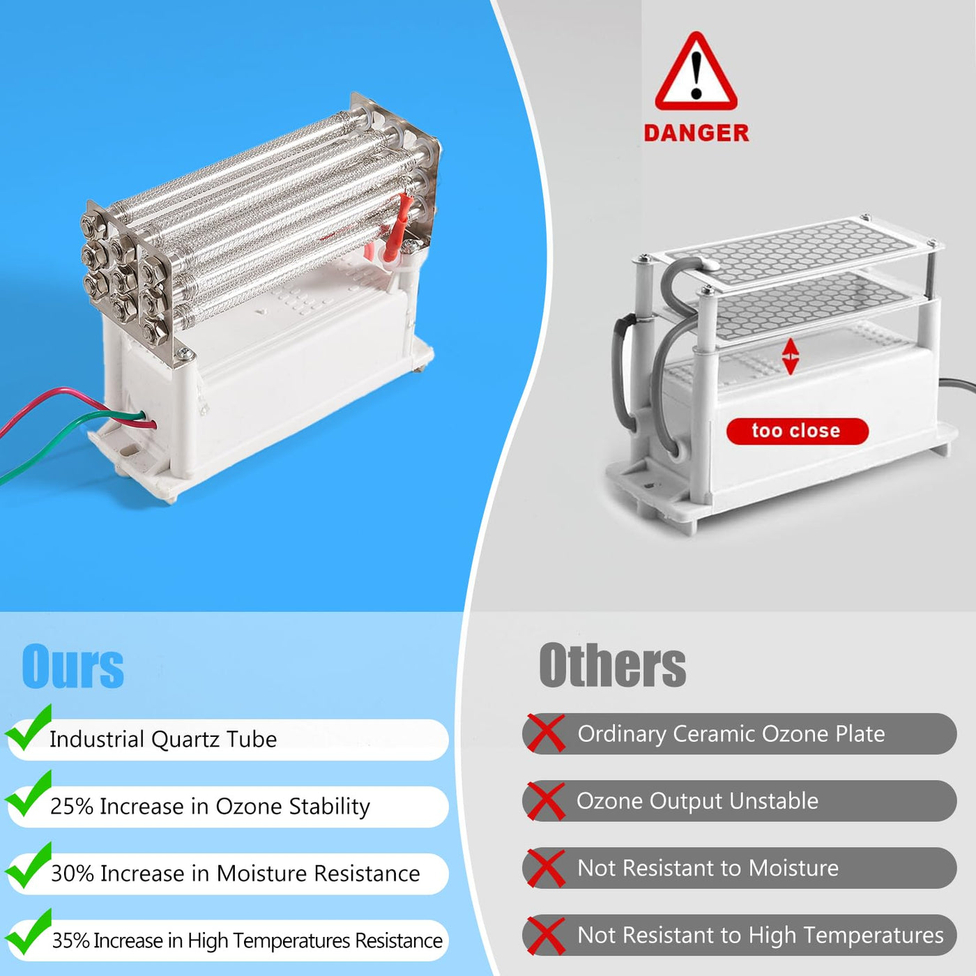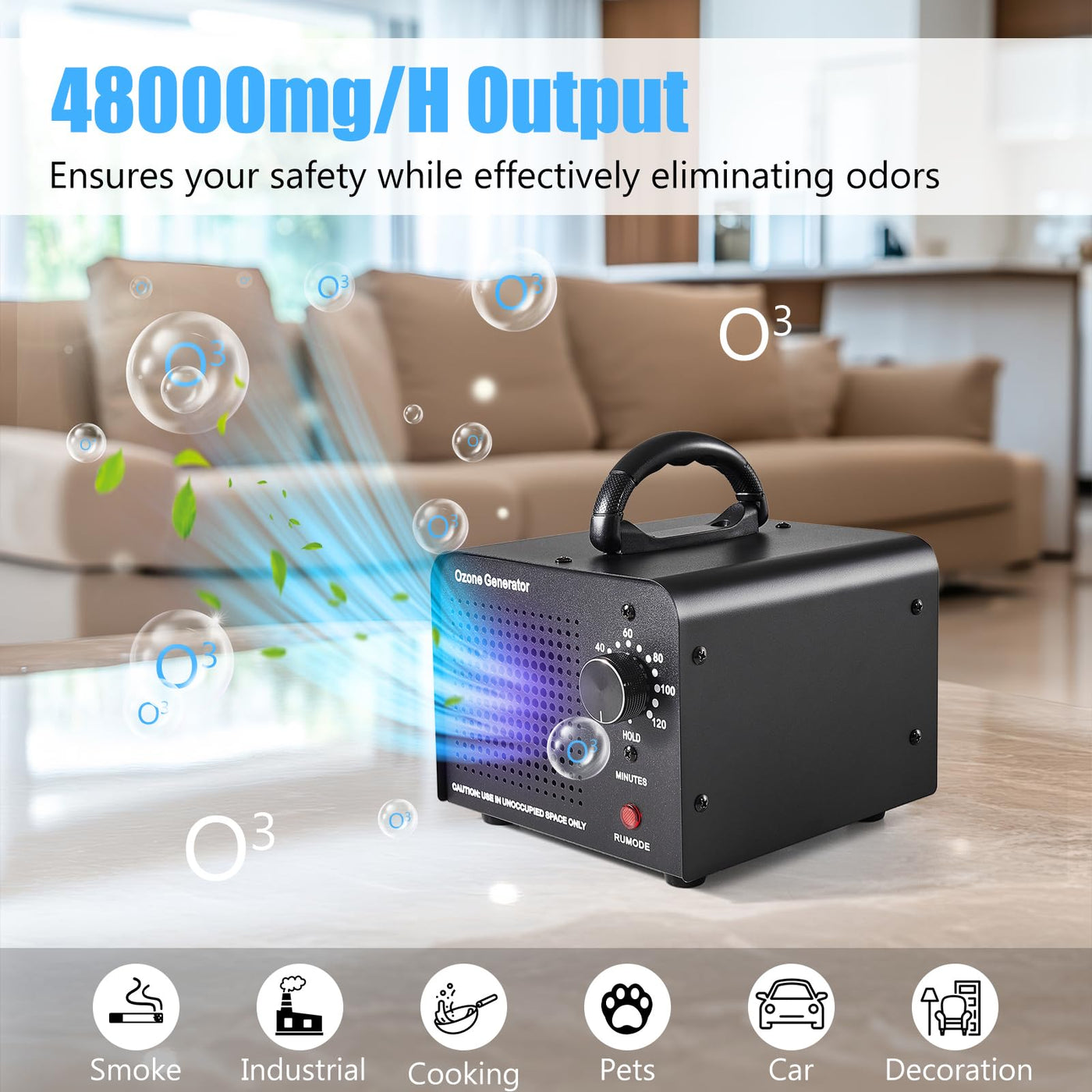 High Capacity 48,000Mg/H: Features An Newly Upgraded Industrial Quartz Tube, Up To 40,000 Hours Lifetime, Not Significantly Affected By Humidity, Stable Production Of Ozone In Humid, High & Low Temperature Environments, Anti-Surge Protection Circuit Design, High-Speed Fan Equipped With A Pure Copper Motor For Greater Safety | Wide Application: Ozone Machine Generator Suitable For Home, Car, Industrial, Office, Hotel, Basements, Farm, Boats, School, Kitchen, Pets Room, Smoke, Cooking, New Decoration And Other Spaces, Providing You With A Fresh And Pleasant Environment | Easy To Use: The Timer Knob Can Be Set Up To 120 Minutes, With Hold Key For Continuous Operation. Time Settings Can Be Adjusted Depending On The Size Of The Space. As The Odors Are Neutralized, A Clean And Fresh-Smelling Atmosphere Will Remain | Attention Points: Use Only In Unoccupied Spaces. Please Remove Any Person, Pet Or Plant Before Use And Require. Don'T Let People And Pets Enter The Area Until 30 Minutes After Commercial Ozone Machine Ends. After Using For More Than 4 Hours, Recommend To Shut Down The Machine For A Period Of Time | Excellent Service: An Ideal Air Purifier To Help You Effectively Eliminates Various Odors Promptly, Improving Overall Quality Of Life. If You Have Any Questions About Our Products, We Will Provide You With Excellent Customer Service (Not For Sale In California)
