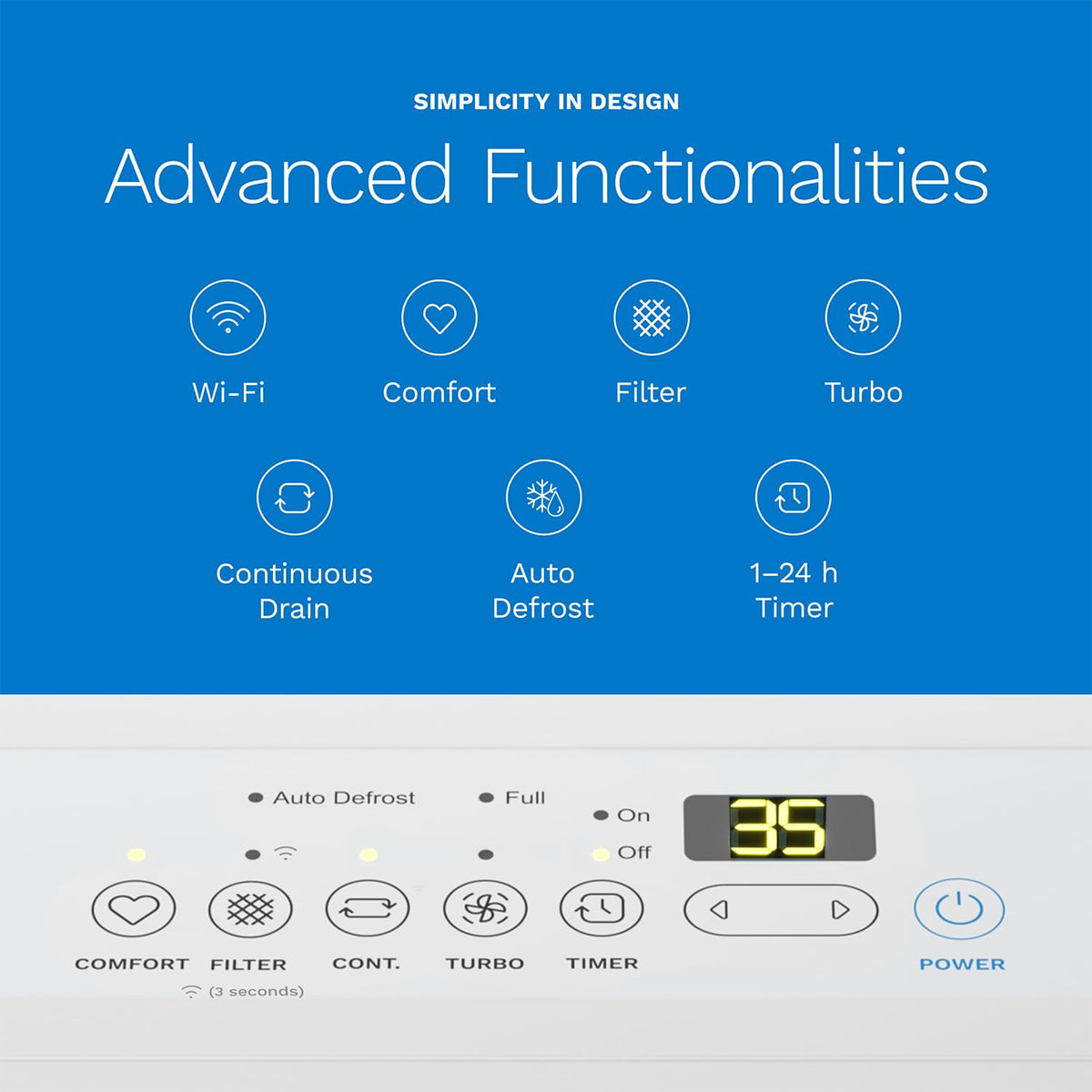 Large Room Dehumidification: This Compactly Designed Dehumidifier Caters To Large Rooms Up To 4,500 Sq Ft. It Can Remove Up To 50 Pints Per Day (70 Pint 2012 Doe Standard), Making It Ideal For Large Indoor Wet Spaces. | Wifi-Enabled Smart Functionality: Adjust Your Settings And Control Your Dehumidifier Remotely. With The Cutting-Edge Wifi Feature, Connect Your Dehumidifier To Your Home'S Network And Manage Your Comfort From Anywhere. | Stylish For Modern Homes: We'Ve Designed With The Modern Consumer In Mind, Providing A Sleek Appearance, Convenient Wheels And Handles, And A Subdued Fan That Won'T Interfere With Your Quiet Activities. | Ease Of Use: Simplicity At Its Best - Adjust To Your Preferred Moisture Setting And Let It Operate Continuously Until The Tank Is Full, Upon Which It Will Automatically Shut Off. For Continuous Drainage, A Hose Outlet Is Provided (Hose Not Included). | Efficient Moisture Removal: This Advanced Dehumidifier Works Through Its Built-In Pump Compressor, Featuring A Turbo Mode To Maximize Fan Speed From Normal Air Cfm 188 To High Air Cfm 218.