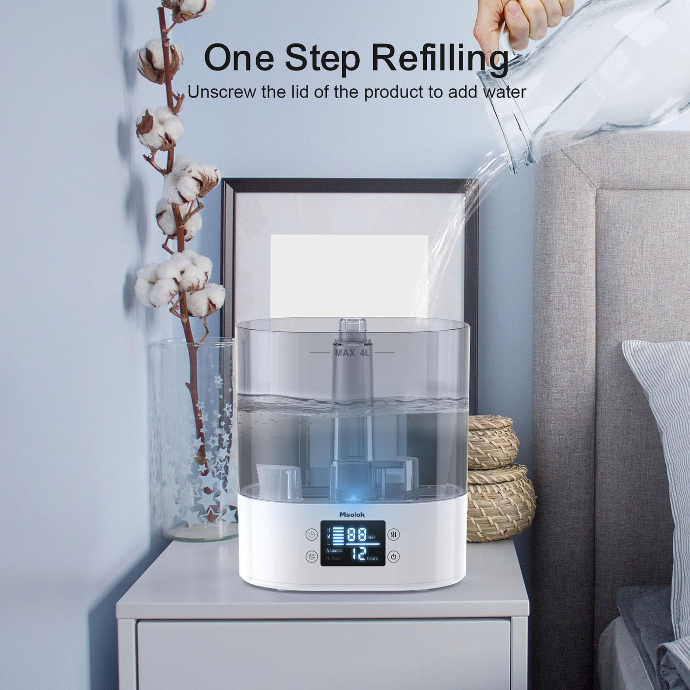 Q: How long can the humidifier run on a single fill?A: The 4-liter water tank of this humidifier can last up to 40 hours on a single fill, allowing you to enjoy continuous moisture without frequent refills, making it ideal for overnight use.