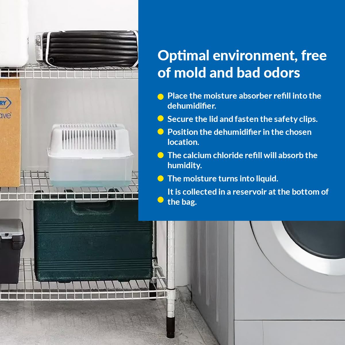 It Is A Pack Of 6 Dehumidifiers That Absorb Excess Moisture By Condensation In Spaces Of Up To 400 Sq. Ft. Or Any Poorly Ventilated Space Such As: Storage Rooms, Halls, Garages, Basements, Or Offices. This Dehumidifier Is Safe And Effective As It Absorbs And Retains Moisture In Liquid Form And Stores It In The Tank. Contents: 6 Large Dehumidifiers And 6 35.3 Ounce Refills. This Moisture Absorber Is A Product That Absorbs, Regulates, And Maintains Optimal Levels Of Environmental Humidity (40-60%), Without Drying Out The Environment. In Addition, Thanks To The High Quality Materials From Which This Moisture Absorber Is Made, It Offers Great Durability And Resistance. It Is Reusable And Can Be Washed In The Dishwasher. This Non-Electrical Dehumidifier Device Has A Secure Clipping. It Absorbs Moisture And Converts It Into Liquid That Is Deposited In The Bottom Container Of The Device. Can Be Refilled With Either 35.3 Oz Or 15.9 Oz. Moisture Absorber Refills. It Has A Large Capacity Tray That Prevents Accidental Overflow Of Stored Liquid. It Does Not Require Electricity To Work, Which Represents Great Energy Savings.To Refill The Moisture Absorber Device, You Just Have To Place The Anti-Humidity Refill In The Filter Of The Dehumidifying Device, And It Will Start Working Immediately. It Is An Excellent Environmental Friendly Option To Achieve A Healthier And More Comfortable Environment.
