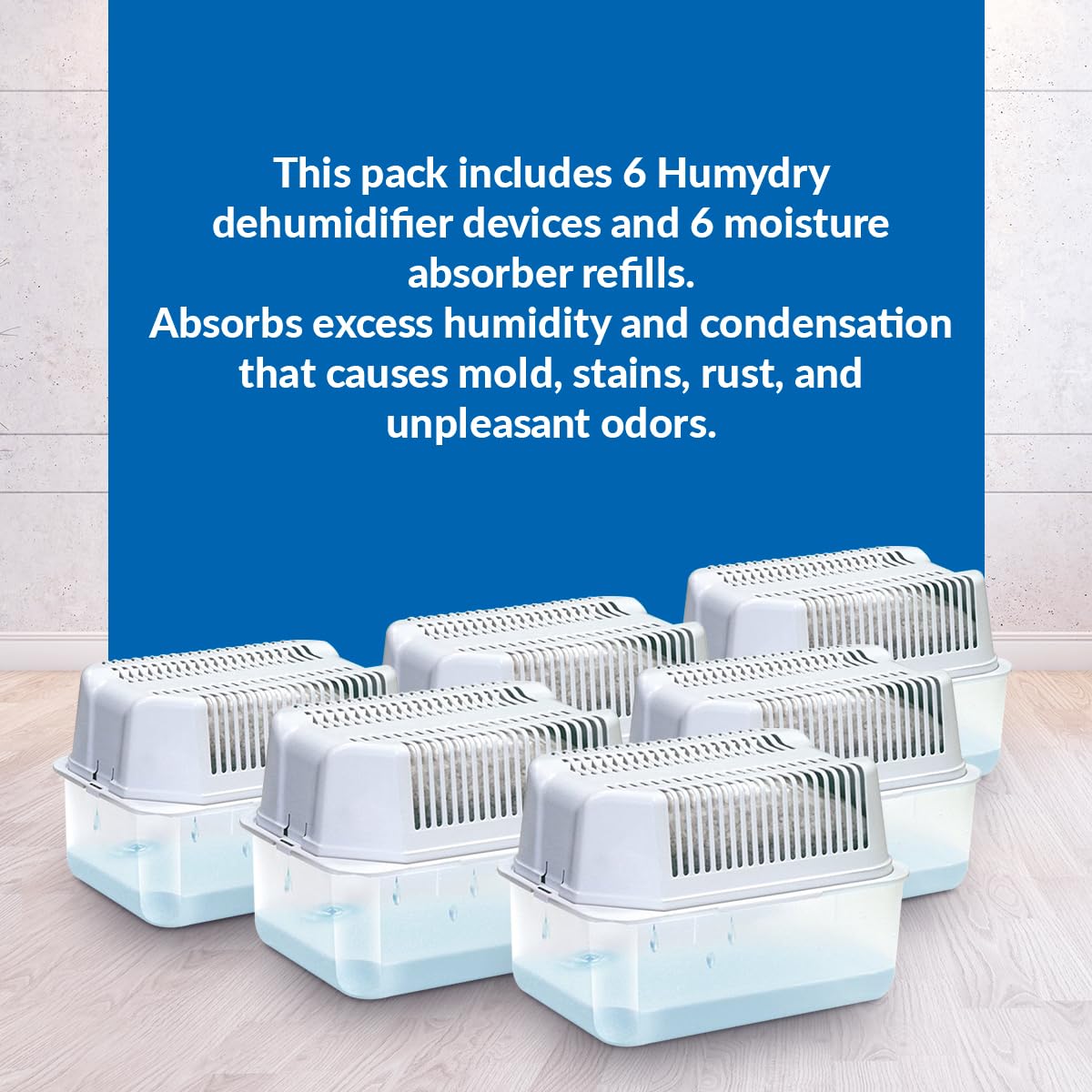 Humydry Pack Of 6 Dehumidifier Devices With 6 Moisture Absorber Refills 35.3 Oz Large Size Fragrance Free Ideal For Sp