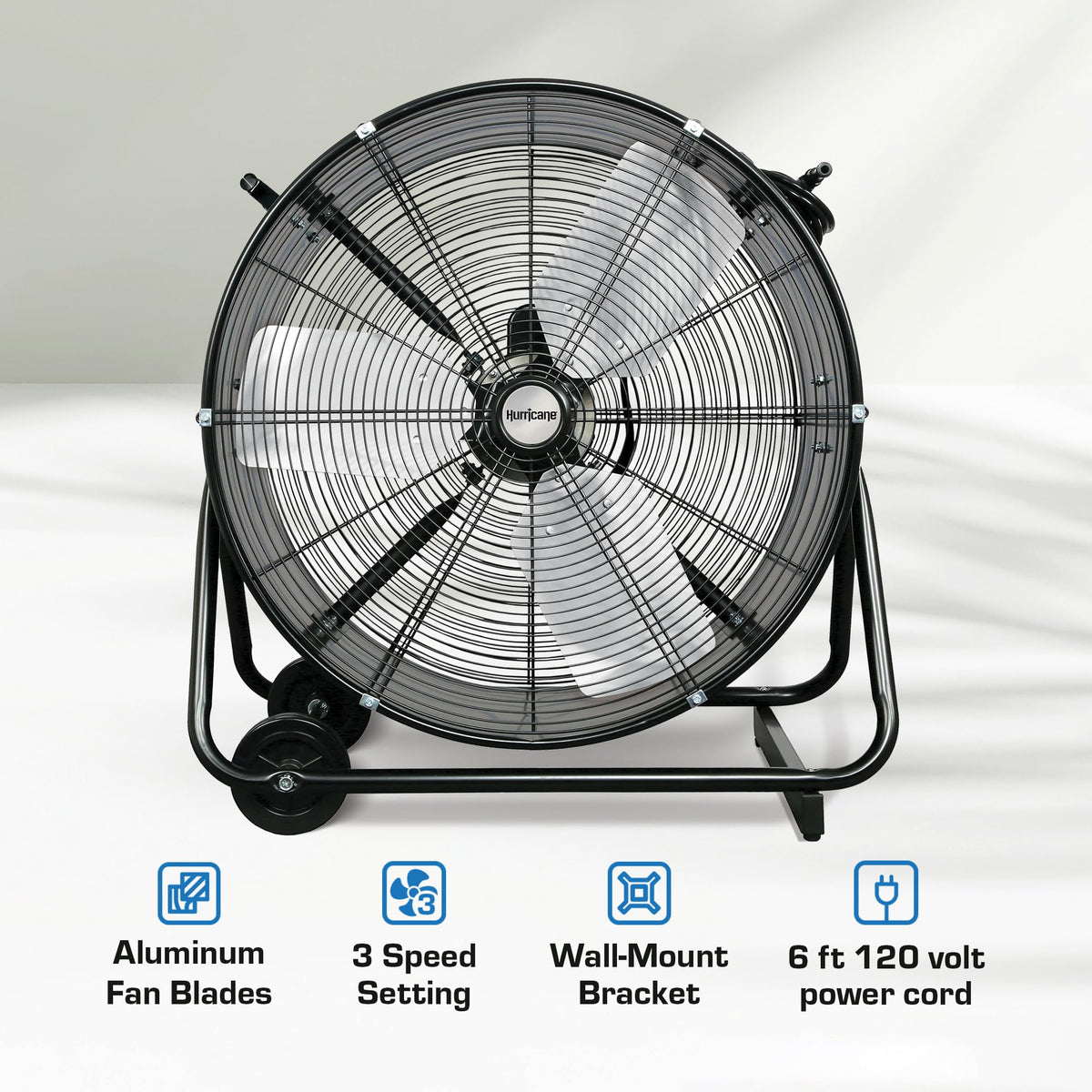 Engineered For The Toughest Jobs, The Hurricane Pro 24'' Adjustable Tilt Drum Fan Is The Ultimate Solution For Demanding Cooling Tasks. Whether Youre Working In A Garage, Greenhouse, Workshop, Or Any Large Space That Demands Powerful Airflow, This Fan Is Built To Deliver. With Its Rugged All-Metal Construction And Durable Black Powder-Coated Finish, The Hurricane Pro Is Designed To Withstand The Most Demanding Environments While Maintaining Top Performance. The Hurricane Pro Doesnt Just Move Air; It Moves Air With An Incredible 7195 Cfm, Ensuring Even The Largest Spaces Stay Cool And Comfortable. The Adjustable Tilt Feature Lets You Direct This High-Velocity Airflow Exactly Where You Need It, Giving You Complete Control Over Your Environment. Whether Youre Ventilating A Stuffy Greenhouse, Cooling Down A Hot Garage, Or Creating A Breeze In A Workshop, This Fan Is Up To The Task. Versatility Is Key, And With Three Speed Settings, The Hurricane Pro Adapts To Your Specific Needs. Whether You Require A Gentle Breeze Or Full-Force Ventilation, You Can Easily Adjust The Speed To Match The Conditions. Its Aluminum Blades Are Not Only Durable But Also Efficient In Maximizing Airflow, Making Sure You Get The Best Performance Every Time. Portability And Convenience Are Also At The Heart Of The Hurricane Pros Design. Despite Its Robust Build, Its Easy To Move Wherever You Need It Most, Ensuring That Big Jobs Dont Become Bigger Headaches. With A 6 Ft. 120 V Power Cord, You Have The Reach And Flexibility To Position This Fan Exactly Where Its Needed, Making It The Ultimate Solution For Large-Scale Cooling And Ventilation.
