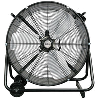 Q: Is the Hurricane Pro 24” Drum Fan suitable for outdoor use?A: Yes, the Hurricane Pro 24” Drum Fan features a durable all-metal construction and a black powder-coated finish, which allows it to withstand outdoor conditions, making it suitable for use in garages, workshops, and greenhouses.