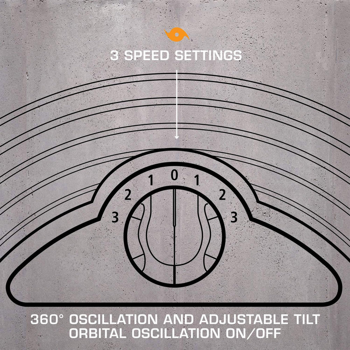 Q: What are the main features of the Hurricane Pro Series 16 Inch High Velocity Metal Orbital Fan?A: The Hurricane Pro Series fan features a durable all-metal construction, a sleek black powder-coated finish, and efficient aluminum blades. It offers 3 adjustable speed settings, 360-degree oscillation for maximum airflow coverage, and comes with a wall mount bracket and a 5-foot power cord for easy installation.