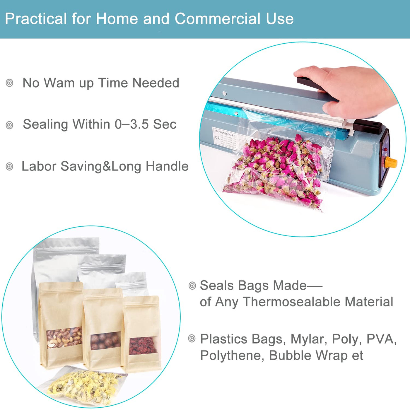 Q: Is the Impulse Sealer safe to use for home and commercial purposes?A: Absolutely! The Impulse Sealer is designed with safety features, including built-in precision circuit controls and a fuse. It is perfect for both home use and commercial settings such as supermarkets, kitchens, and grocery stores.