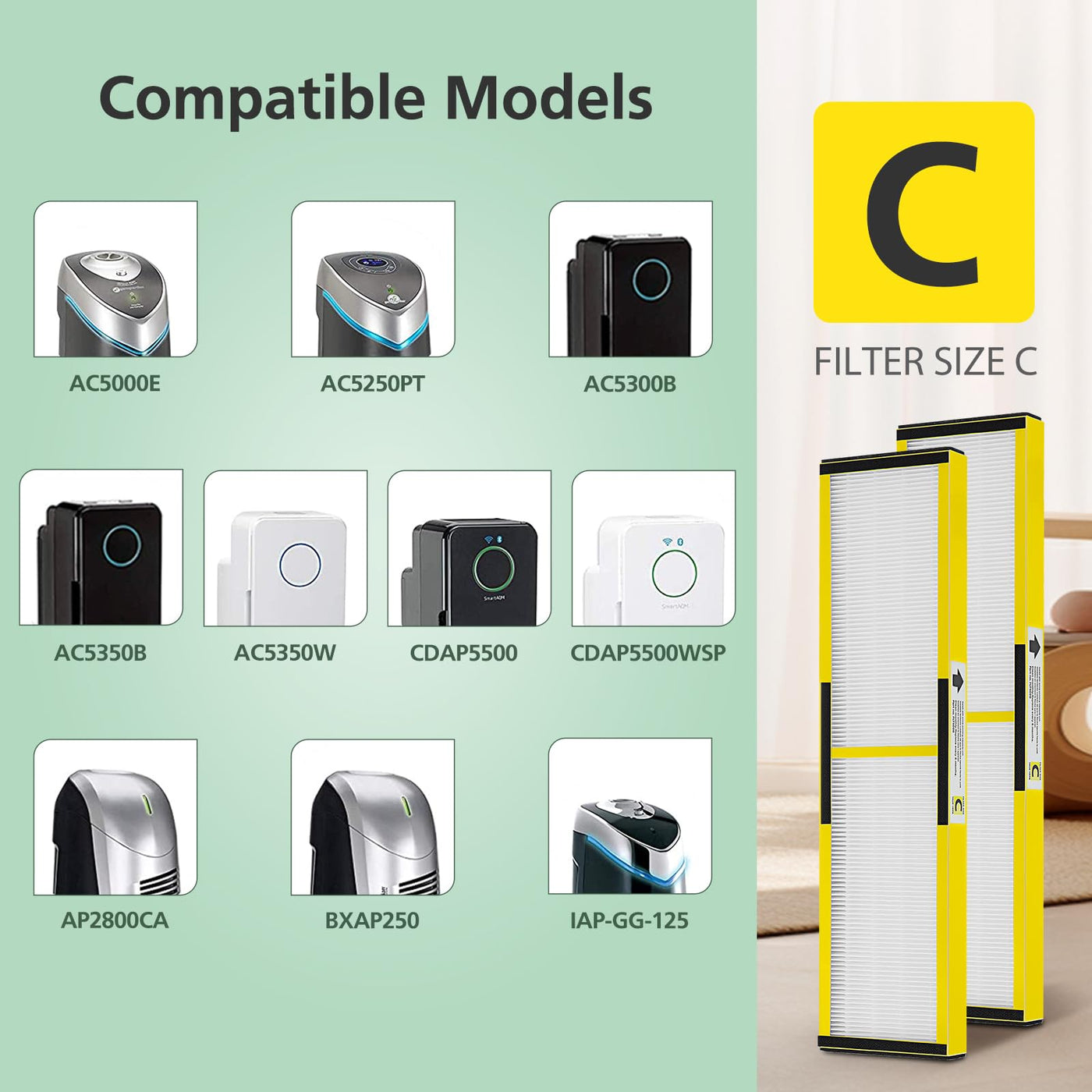 Q: What air purifier models are compatible with the isinlive FLT5000 True HEPA Filter C?A: The isinlive FLT5000 True HEPA Filter C is compatible with G-Guardian air purifier models from the AC5000 series, including FLT5000, FLT5111, FLT5250PT, AC5000, AC5000E, AC5300B, AC5250PT, AC5350B, AC5350BCA, AC5350W, and CDAP5500B. It is also suitable for PureGuardian Model AP2800CA and Black+Decker BXAP250.
