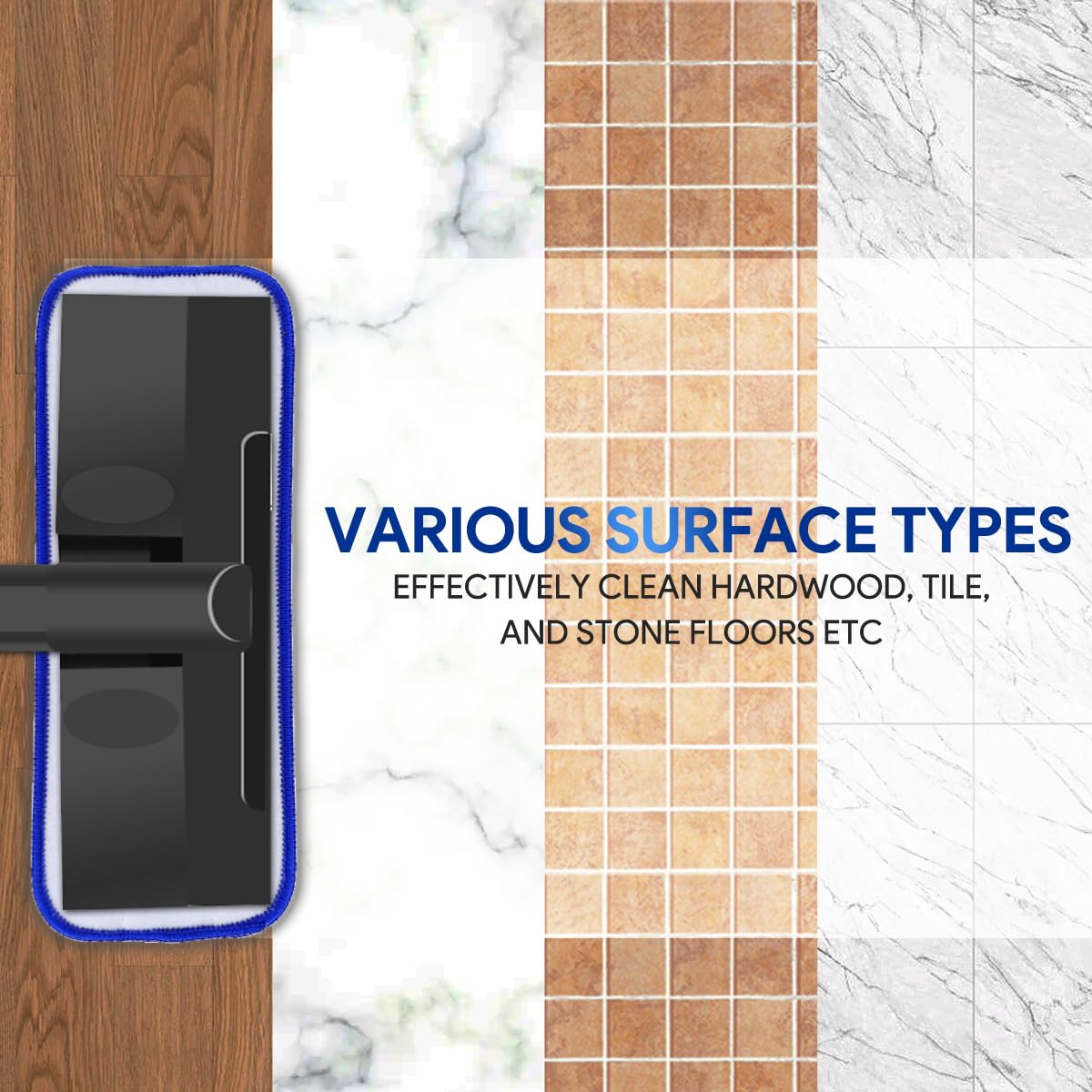 Q: What surfaces can I use these microfiber pads on?A: These microfiber pads are designed for use on various surfaces, including hardwood, tile, and stone floors, ensuring effective cleaning across multiple surface types.