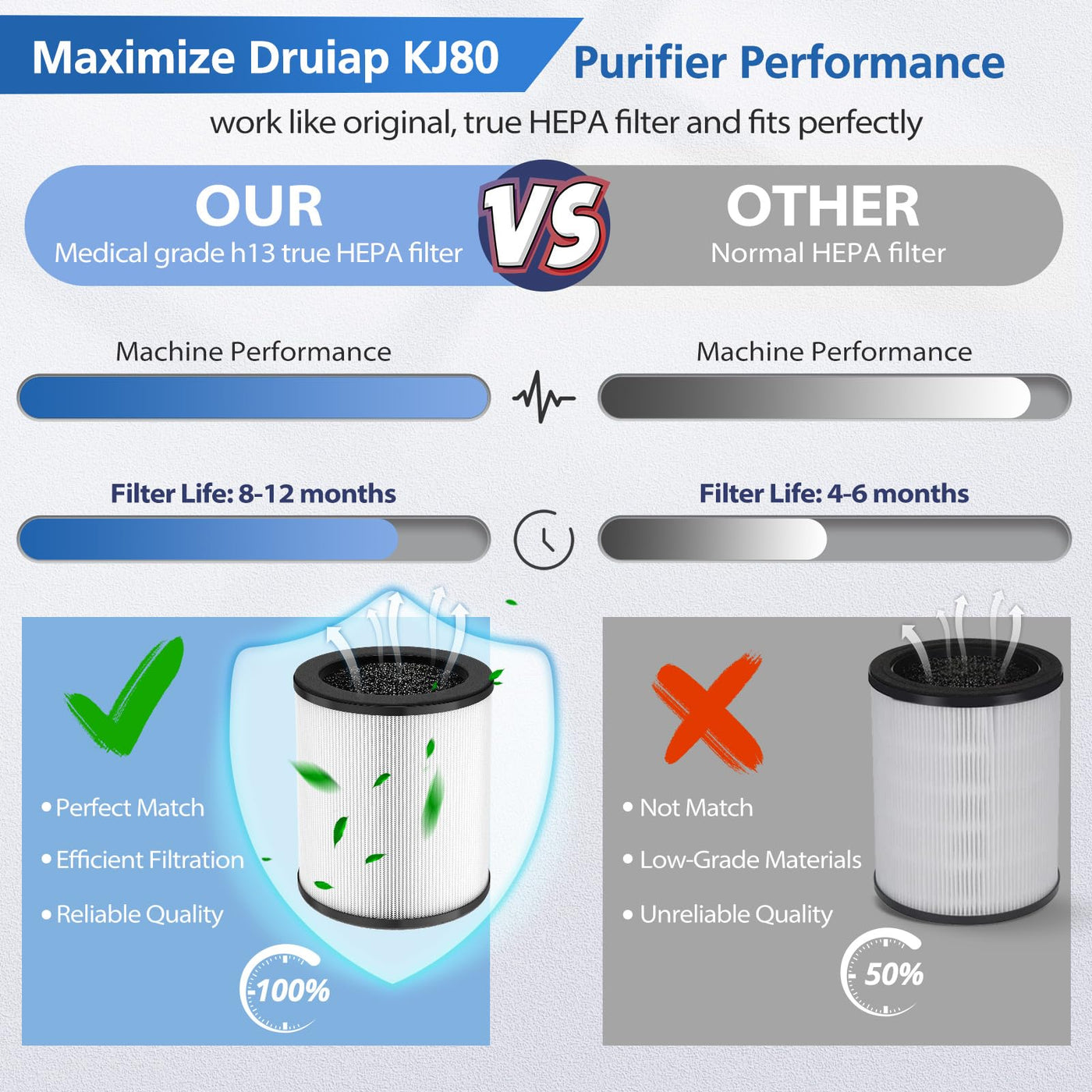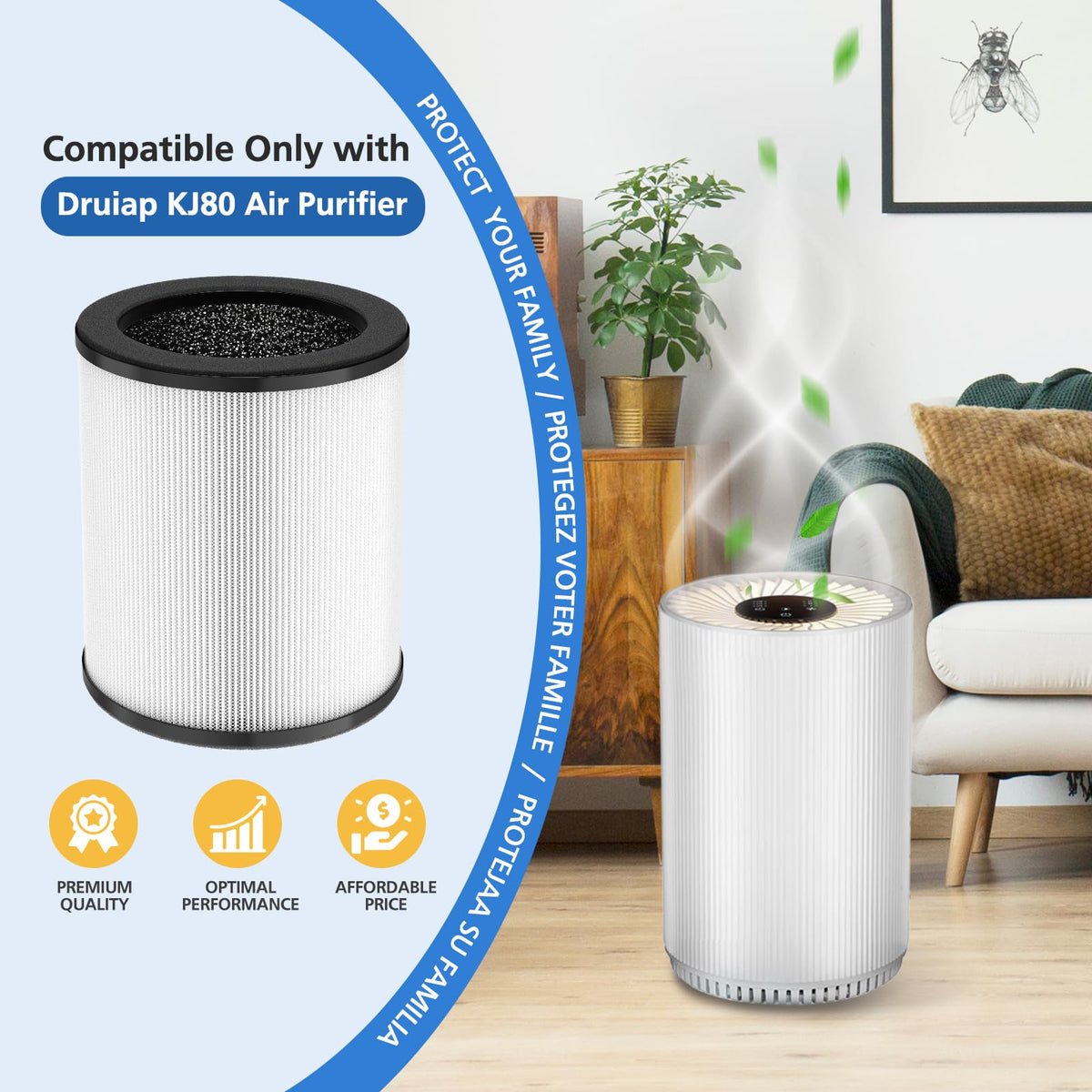 Why Choose Us?Our Mission Is To Provide Good Products And Services To Our Customers And Improve The Health And Wellness Of Our Community With Purified Air While Allowing Everyone To Get Tangible Benefits.Product; Details1) Compatible Models: Perfect Fit For Druiap Kj80, Not For Druiap Kj1502) 3-In-1 Filtration System: The Kj80 Replacement Filter For Druiap Is A 3-In-1 True Hepa Filtration System Including Ultra-Fine Pre-Filter, True Hepa Filter, And Activated Carbon Filter. The Kj80 Replacement Filter For Druiap Can Effectively Attach&Nbsp;&Nbsp;&Nbsp; 99.97% Of All Airborne Particles Down To 0.3 Microns In The Air Like Dust, Hairs, Pet Fur, And Lint, And Prolongs The Life Of The Hepa Filter For Druiap Kj80 Air Purifier To Keep Clean From Dust, Pollen, Smoke Particles, Pet Dander. Creating Fresh And Purified Air For You And Your Family.3) Removes Unpleasant Odors: High-Grade Replacement Filter For Druiap Kj80 Layer Improves Deodorant Ability By 60%, Helps Reduce Unpleasant Odors And Fumes Such As Smoke, Cooking Odors, And Pet Odors, As Well As Vocs, Which Makes It A Good Choice For Homes With Pets, Cooking, And Smokers. Reduce All Odors And Gases From Your Home To Improve The Air Quality And Your Health Without Worrying About Second-Hand Pollution.4) Buy With Confidence: We Provide A 90-Day Warranty Or Refund For Each Customer, We Value All Customers, And Our After-Sales Team Will Provide Each Customer With Satisfactory Service. If You Have Any Problems With The Filter Fitting Your Air Purifier;&Nbsp;&Nbsp;&Nbsp; Please Contact Us.This Replacement Filter Is Compatible With Druiap Kj80 Air Purifier. Clean Every Corner For You To Provide The Cleanest And Most Comfortable Environment.