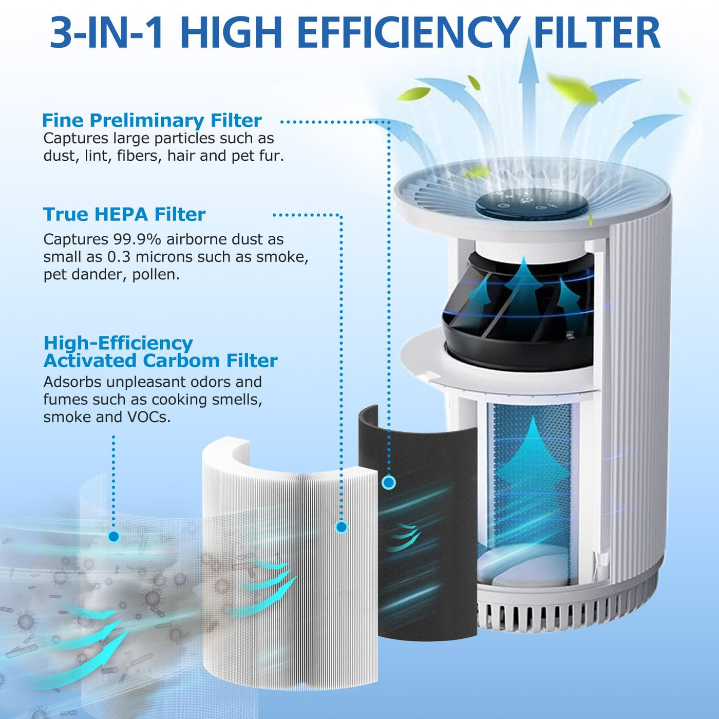 Q: What are the benefits of using the 3-in-1 filtration system in the KJ80 filter?A: The 3-in-1 filtration system includes an Ultra-fine Pre-Filter, True HEPA Filter, and Activated Carbon Filter, which work together to effectively capture 99.97% of airborne particles down to 0.3 microns, including dust, pet dander, and smoke. This system also helps eliminate unpleasant odors, improving the overall air quality in your home.