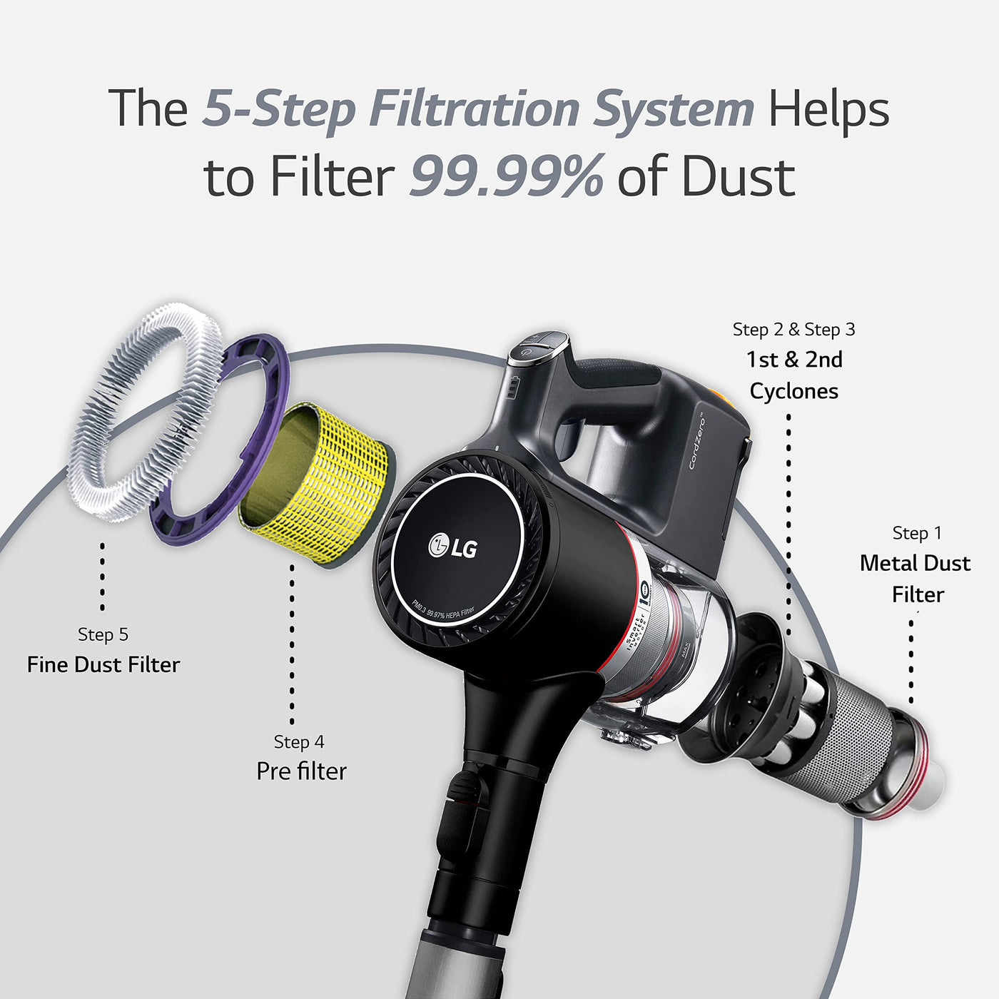 The Lg Cordzero A913Bm Stick Vacuum Cleaner Boasts Strong Suction And A Detachable Quick Release Battery For Up To 50 Minutes* Of Long Lasting Cleaning Performance. With The Lg Cordzero Vacuums Portable Charging Stand, You Can Easily Store Tools And Extra Battery** - Without Drilling Holes Into Your Wall. Turn The Vacuum Cleaner On And Off Easily, Or Select Different Power Levels, Including Turbo Mode, With The Touch Of A Thumb. That Means Less Strain On Your Hand And A More Comfortable Clean. Extend The Life Of Your Stick Vacuum With Easy To Maintain Removable And Washable Filters. Unlike Other Vacuums That Only Let You Remove The Filter, Lg Cordzero Lets You Remove Both The Filter And The Cyclone System To Clean Away Dirt And Keep Your Cordless Vacuum Cleaner Running At Its Best. The 5-Step Filtration System Helps To Filter 99.99% Of Dust*** By Separating Suctioned Dust In The Dust Bin, Then Filtering The Remaining Fine Dust. The Adjustable Telescopic Wand Allows For More Flexibility And Conveniently Stores Away To Save Space. Effectively Lifts Dust, Dirt And Pet Hair From Hardwood Floors And Carpets Thanks To The Direct Drive Motor Inside The Nozzle Cleaning Head. Detach The Hand Vacuum For Quick And Easy Spot Cleaning. Easily Switch Between Floors And Furniture With The Versatility Of The Detachable Handheld Vacuum. *In Normal Mode Without Power Nozzles Using One Battery. **Second Battery Sold Separately. ***Based On Testing Performed By Slg Prf- Und Zertifizierungs Gmbh On April 24, 2018. The Certified Asthma & Allergy Friendly Mark Is A Registered Certification Mark Of The Asthma And Allergy Foundation Of America And Allergy Standards Ltd.