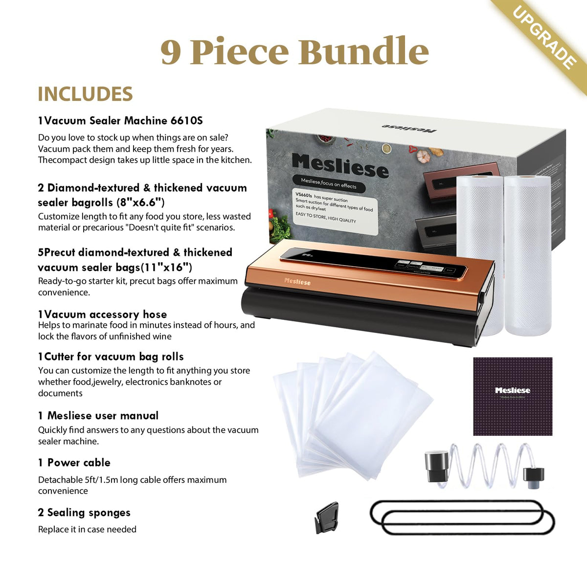 ?Keep Food Fresh And Save Money?Mesliese Vacuum Sealer Machine Is Designed To Provide A Powerful Suction With Max 90Kpa, Making It Much Easier And Quickly To Vacuum All Kinds Of Food. A More Helpful Way To Save Money And Time. Keep Your Food Or Fruits Fresh 10 Times Longer Than Ordinary Storage Methods In The Freezer. | ?6-In-1 Functions? 6 Functions Of Mesliese Food Sealer Meet All Your Needs To Preserve Various Kinds Of Food. ''Dry&Moist'' Modes And ''Normal&Soft'' Modes For You To Choose Depend On The Food Types. ''Seal'' And ''Vac&Seal'' Methods Are For Only Sealing Or Vacuuming & Sealing The Bag. What'S More, You Can Also Use The Vacuum Tube For Vacuuming Canisters, Jars, Or Wine Bottles. | ?Tested 90Kpa Powerful Suction?Mesliese Vacuum Sealer Supports 20 Times Continuous Sealing With 120W Strong Power. The Heavy-Duty Motor Provides Real 90Kpa Powerful Suction, Vacuuming The Food More Tightly Than Ordinary Machine. Vacuum Time 3-10S, Sealing Time 9-12S. Allows You To Preserve Your Food With No Hassle. | ?Easy To Clean And Storage?The Stainless Steel Surface Plus The Smooth Cambered Vacuum Chamber Make It Much Easier To Clean Than Other Brands Machines, No Food Residue Leaving In The Vacuum Chamber. More Convenient, Healthy And Clean. Unit Size Is 14.9*5.7*3.5 Inch, Compact To Store. | ?5 Year Warranty And Satisfied Service?You Will Receive 1X Vacuum Sealing Machine, 2X Vacuum Rolls (8''X6.6'), 5X Pre-Cut Bags (Bpa Free, 11''X16''), 1X User Manual, 1X Air Suction Hose, 1X Ac Power Cable, 2X Sealing Sponge/Gaskets. Mesliese Offers 5-Year Warranty With Refund/Replacement Available. We'Ll Be Pleased To Help You With Any Issue. | ?12Mm Widened Heating Strip?It'S Designed To Widen The Heating Strip Up To 12Mm With Strengthen Sealing Material, Ensuring Much More Tight, Durable And Steady Sealing Effect. 5-Layer Heating Wire Design Offers More Secure And Even Seal.
