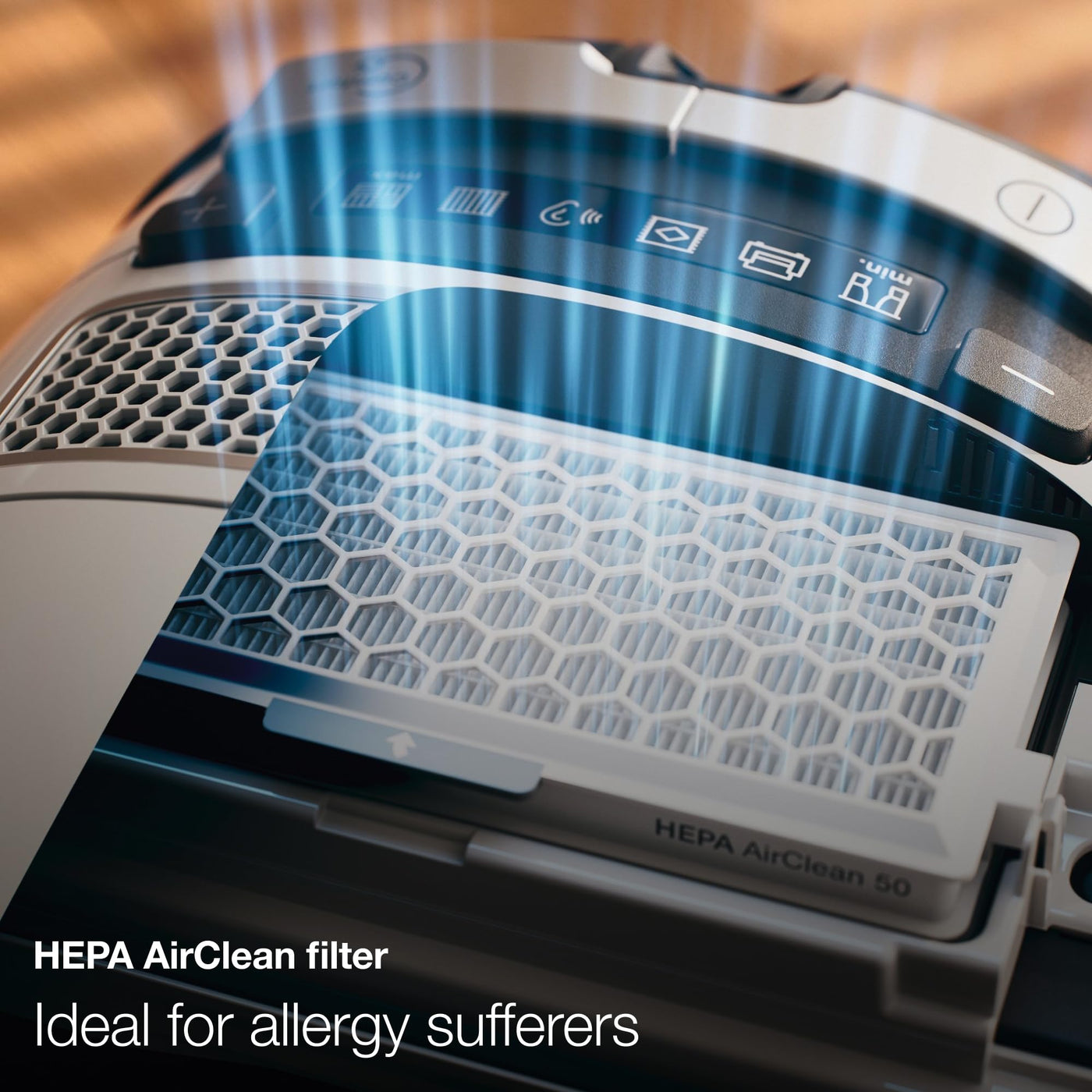 Q: How effective is the HEPA Lifetime Filter in this vacuum?A: The HEPA Lifetime Filter in the Miele Complete C3 Calima captures up to 99.999% of fine dust and allergens, ensuring maximum air hygiene and cleaner air quality in your home.