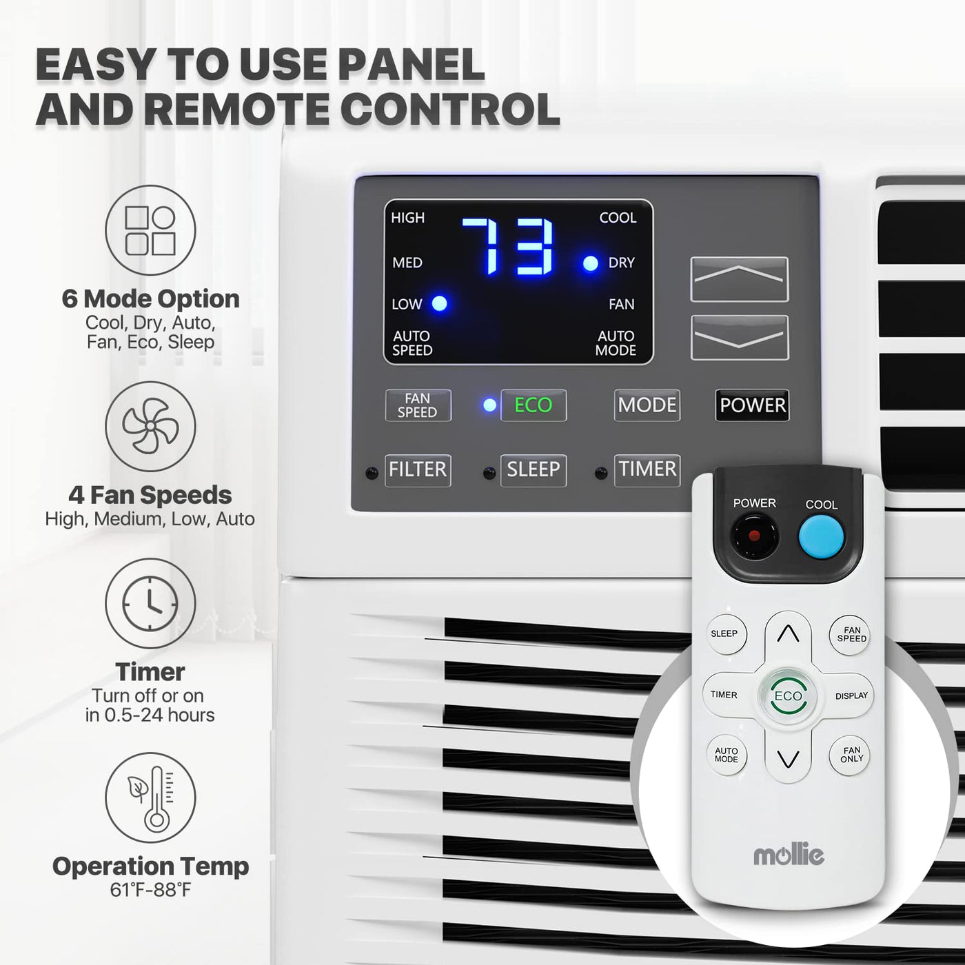 Q: What are the installation requirements for this window air conditioner?A: The mollie window air conditioner is designed to fit windows measuring between 26 to 36 inches wide and at least 16 inches high. It comes with installation parts and a detailed manual for easy setup.