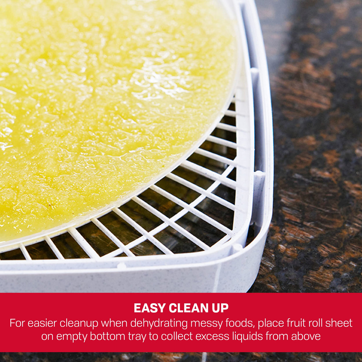 Q: Can I use the Fruit Roll Sheet for drying liquids other than fruit purees?A: Yes, the exclusive 'no spill' lip design allows you to dry liquids and semi-liquids, making it suitable for drying sauces, soups, and other messy foods.