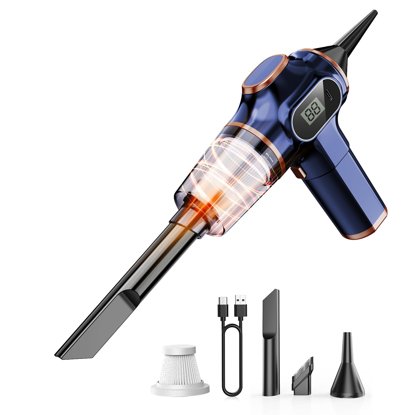 Transform your cleaning routine with this versatile cordless handheld vacuum cleaner. Featuring an informative LCD display and multiple specialized nozzles, this portable vacuum tackles messes in cars, homes, and offices with powerful suction. The rechargeable design eliminates the hassle of cords while maintaining strong cleaning performance for everything from pet hair to keyboard debris. Perfect for quick cleanups, this compact vacuum reaches tight spaces in car interiors, between sofa cushions, and other hard-to-reach areas. The lightweight, ergonomic design makes it comfortable to use, while the cordless convenience means you can take it anywhere. Whether youre detailing your car, cleaning up after pets, or maintaining a tidy workspace, this handheld vacuum delivers the versatility and power you need for effective cleaning on the go.