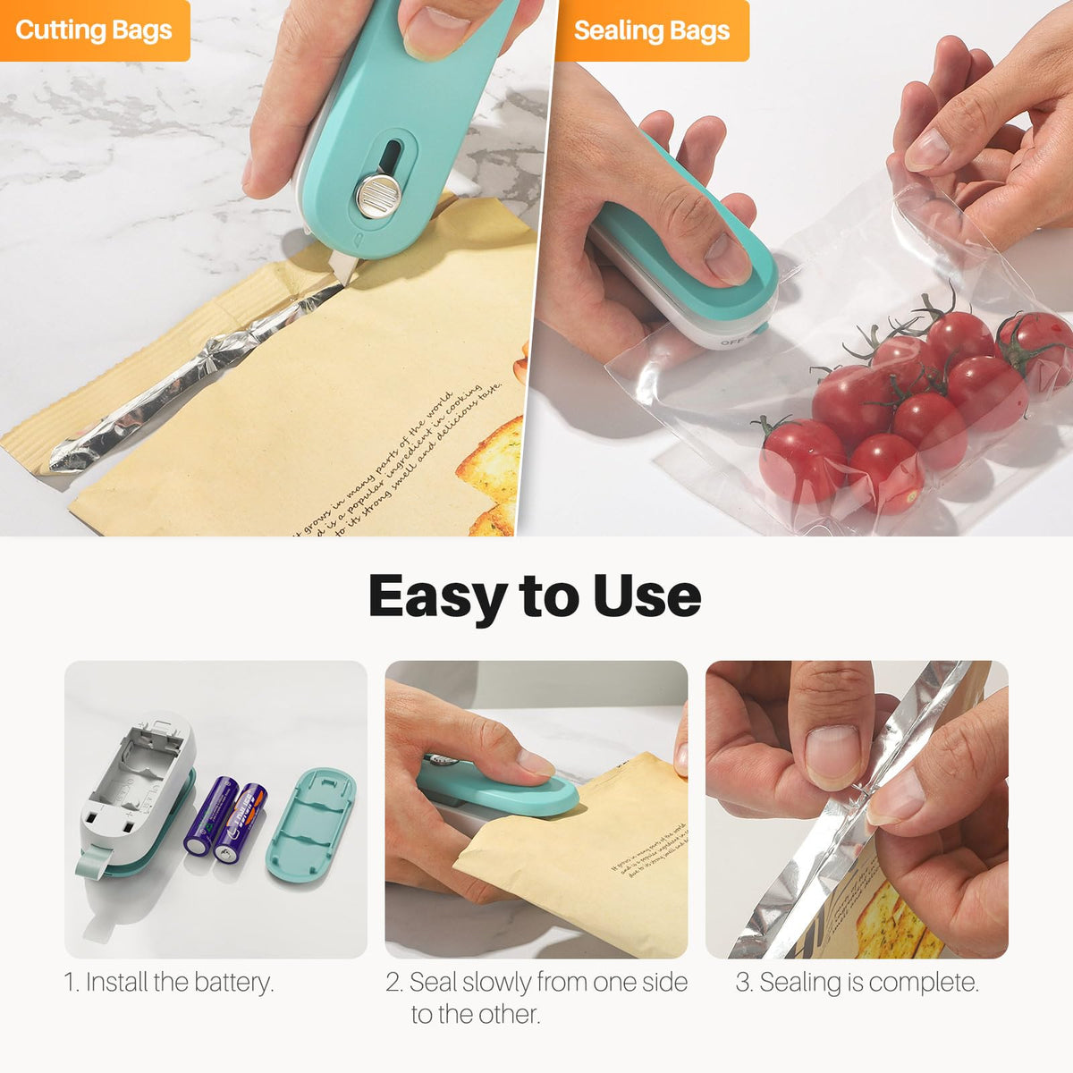 Q: How does the ODSD mini bag sealer work?A: The ODSD mini bag sealer features a simple two-in-one design that allows you to both seal and cut bags. To seal, simply place the bag in the center, clamp down, and slide the sealer across for an airtight seal. For cutting, use the other side to easily open bags without tearing.