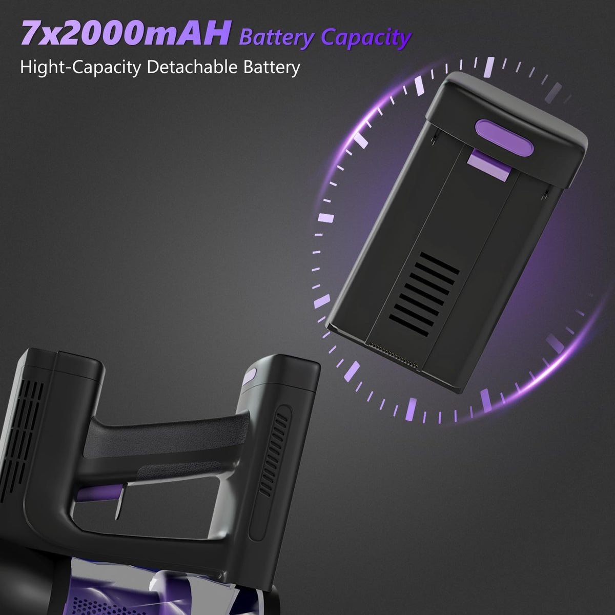 Q: How long does the battery last on a full charge?A: The vacuum cleaner is equipped with a removable 7*2000mAh battery pack that provides sufficient power for fast and deep cleaning. Depending on the suction mode used, the battery can clean the entire house on a full charge.