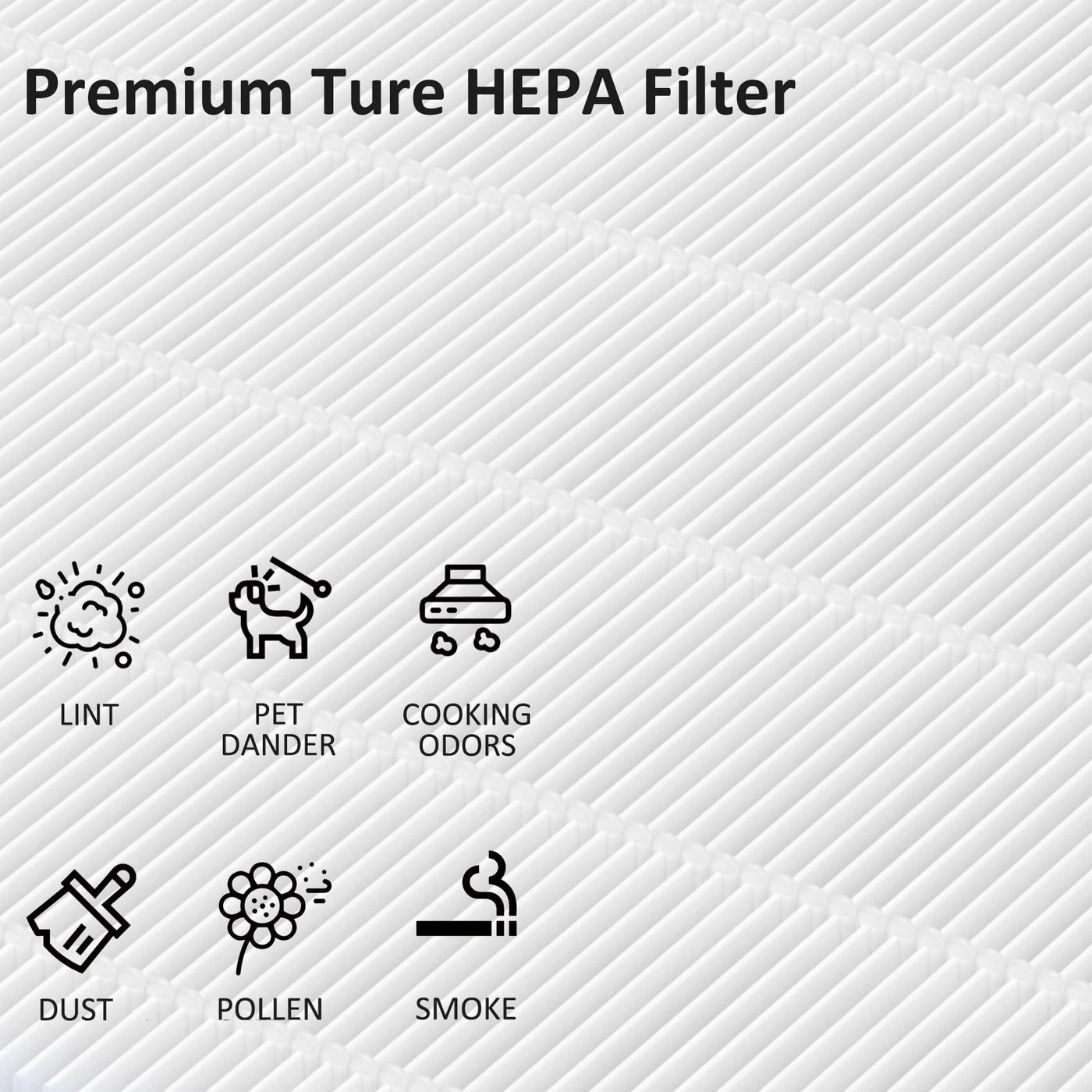Q: What is the efficiency of the H13 True HEPA filters?A: Our H13 True HEPA filters capture 99.97% of airborne particles as small as 0.3 microns, including dust, pet dander, smoke, and other allergens.