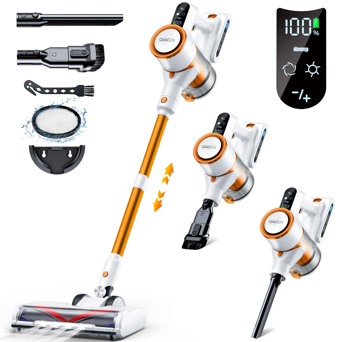 Powerful Suction: Our Qikcln Orange Cordless Vacuum Cleaner Features A Remarkable 23Kpa Suction Power, Allowing It To Effortlessly Suck In Dust, Hair, And Debris. With Two Speeds, The High Speed 23Kpa Setting Is Perfect For Deep Cleaning Carpets And Hard-To-Reach Areas, While The Low Speed 17Kpa Provides Energy-Saving And Efficient Everyday Cleaning. Additionally, The High Speed Of 35000Rmp Ensures Exceptional Cleaning Results, Making It Ideal For Tackling Dust, Pet Hair, And More. | Long-Lasting Battery Life And Smart Display: Equipped With A Removable 2200 Mah High-Capacity Battery, Our Cordless Vacuum Cleaner Offers Up To 40 Minutes Of Runtime On A Single Charge. This Allows You To Clean Large Areas Of Your Home Without Interruption. The Intelligent Led Touch Screen Makes Operation Easy And Intuitive, Displaying The Battery Level, Gear Adjustment, And Real-Time Alerts For A Full Dust Cup Or Clogging. This Convenient Feature Helps You Maintain And Optimize Your Cleaning Time Effectively. | Efficient Filtration And Hygiene Protection: Our Vacuum Cleaner Utilizes A 5-Stage Filtration System, Ensuring A 99.7% Cleaning Performance On Hardwood Floors And Tiles. This Advanced Filtration System Not Only Prevents Dust Leakage But Also Avoids Secondary Pollution. Regular Cleaning And Maintenance Of The Filtration System Ensures Stable Suction Power, Creating A Clean And Healthy Living Environment For You And Your Family. | Unique Brush Design: Designed With A V-Shaped Brush, Our Vacuum Cleaner Greatly Reduces The Problem Of Hair Entanglement, Making It Particularly Suitable For Households With Pets. The Telescopic Pole Can Be Adjusted Freely To Meet The Needs Of Both Adults And Children, Enabling The Whole Family To Effortlessly Use The Vacuum Cleaner. The 180