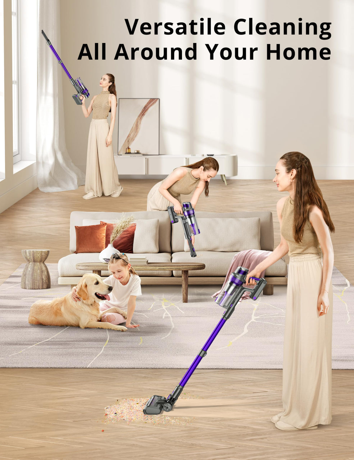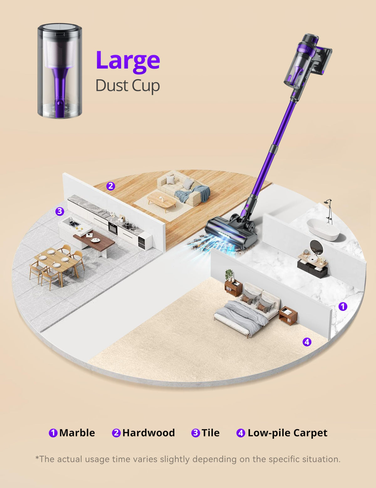 30Kpa Powerful Suction For Deep Cleaning: The Cordless Vacuum Cleaner Features 250W Impressive Suction Power Of 30Kpa, Allowing It To Effortlessly Pick Up Dirt, Dust, Pet Hair, And Debris From Various Surfaces. Its Efficient Design Ensures Deep Cleaning With Ease, Leaving Your Home Spotless | 40 Mins Long Runtime For Uninterrupted Cleaning: Equipped With A Long-Lasting Battery, The Stick Vacuum Offers An Impressive Runtime Of 40Mins At Min Mode, 28Mins At Mid Mode And 15Mins At Max Mode. With This Extended Battery Life, You Can Clean Multiple Rooms Without Interruption, Eliminating The Need For Frequent Recharging And Saving You Valuable Time And Effort | Versatile Cleaning Modes: With Three Cleaning Modes To Choose From, You Can Easily Adjust The Suction Power According To Your Cleaning Needs. Whether It'S Light Cleaning, Deep Cleaning, Or Tackling Stubborn Messes, This Vacuum Cleaner Has Got You Covered | Smart Led Display And Convenient Charging Dock: Thanks To The Smart Led Display, You Can Monitor The Remaining Battery Life And Select The Desired Cleaning Mode At A Glance. Never Run Out Of Power Unexpectedly During Your Cleaning Sessions. Additionally, The Included Charging Dock Provides A Convenient And Organized Place For Storage And Simultaneous Charging. Dock The Vacuum After Use, Ensuring It Is Always Ready For The Next Cleaning Task | Five Layer Fully-Sealed Filtration System: The Vacuum Cleaner Features A 5-Stage Fully Sealed Filtration System, Which Not Only Ensures Stable Suction Performance But Also Prevents Secondary Air Pollution. You Can Breathe Easy Knowing That Your Home Is Far Away From Dust. Note: The Unit Is For Dry Use Only. Please Wash Hepa Filter After Every Use And Change New Hepa Filter Every 2 Months To Main The Optimal Suction Power