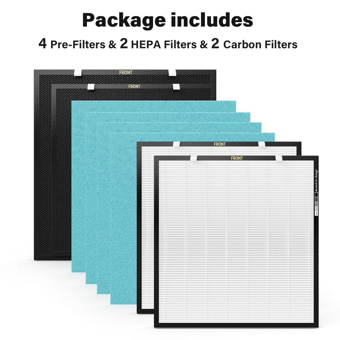 Q: What is included in the RFM80 replacement filter package?A: The RFM80 replacement filter package includes (2) Max v-HEPA filters, (2) Activated Carbon filters, and (4) cleanable pre-filters. This comprehensive package ensures you have everything needed for maintaining your air purifier.