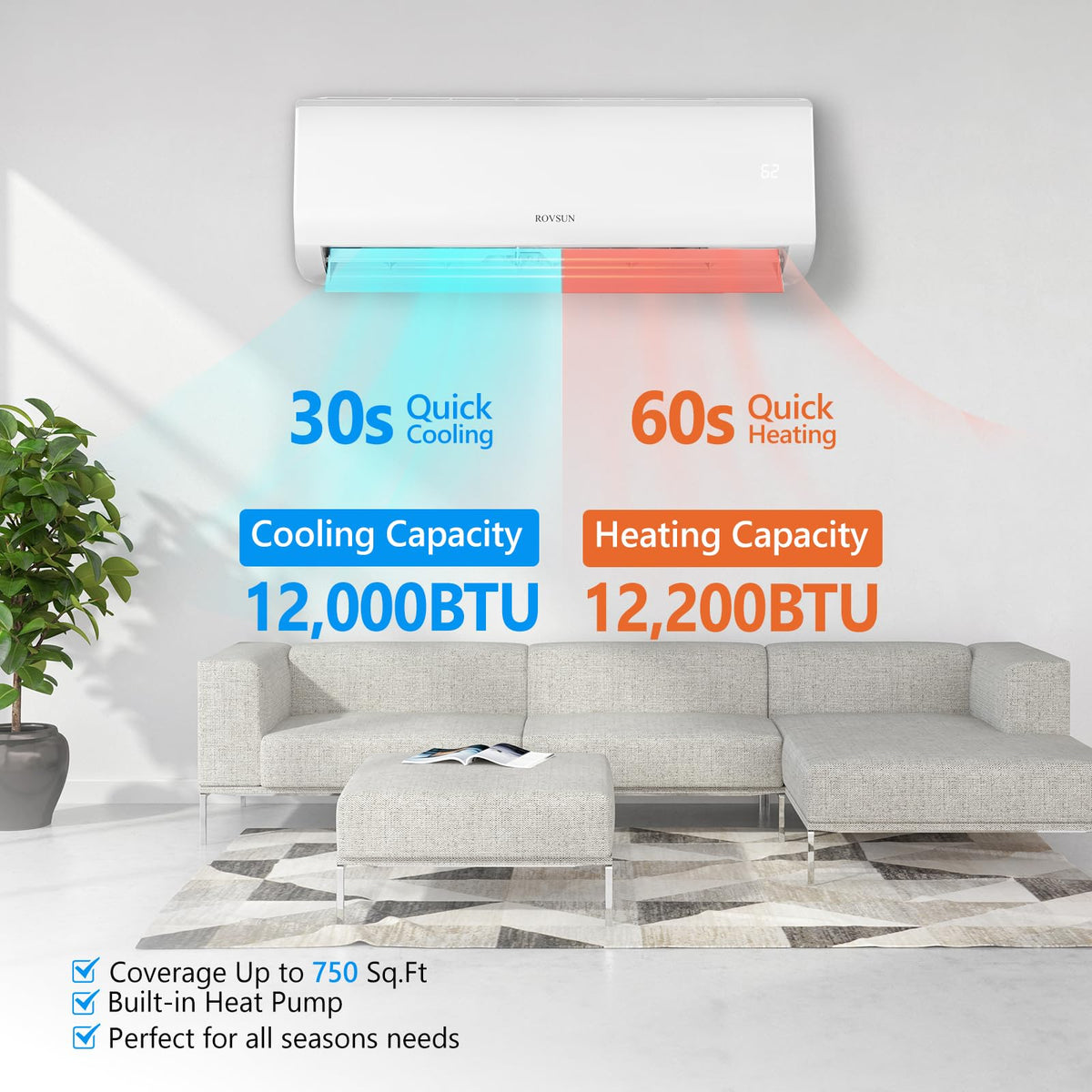 Rovsun 12000 Btu 115V 19 Seer Efficient Ductless Mini Split Inverter Plus System With Heat Pump And Dehumidification, Auto Defro