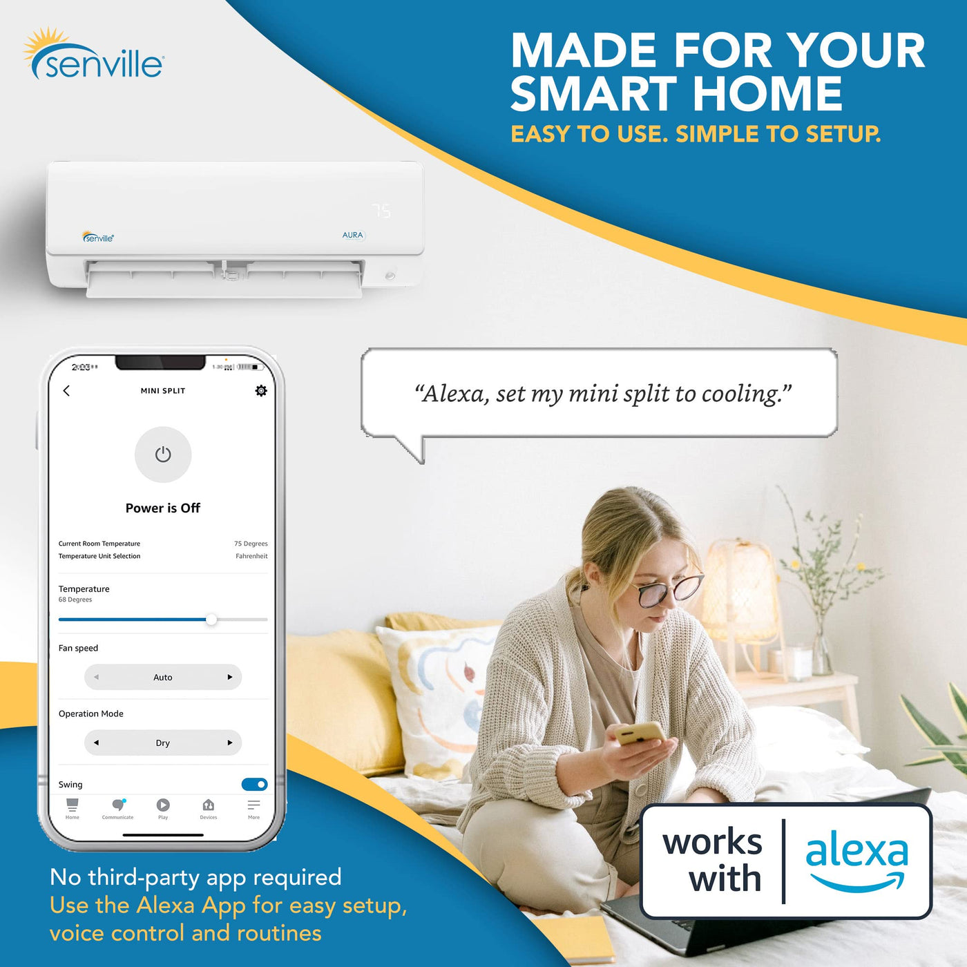 Senville Aura Series Mini Split Air Conditioner Inverter Heat Pump, 12000 Btu, Works With Alexa, Energy Star, White