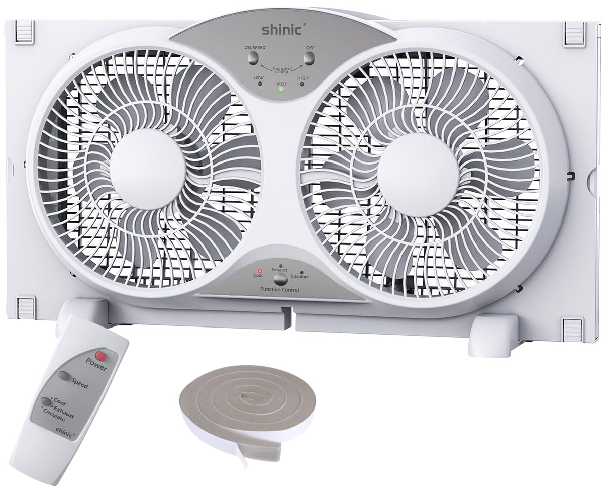Shinic Window Fan With Reversible Airflow Quiet, Twin 9'' Blades, Full Remote Control, 3 Functions 3 Speeds, Bathroom Kitchen Wi