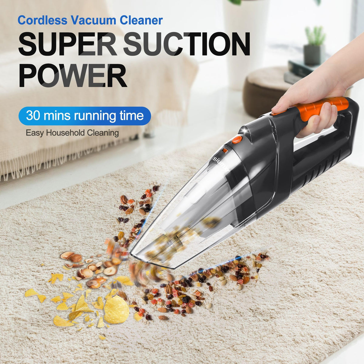 Q: How long does the battery last on the siumxr Handheld Vacuum?A: The siumxr Handheld Vacuum features a powerful long-lasting lithium battery that provides up to 30 minutes of runtime after a full charge of just two hours.