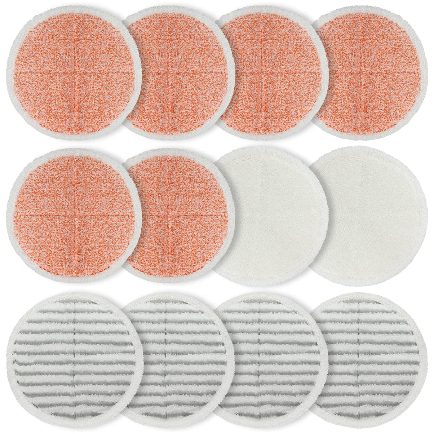 Q: What types of pads are included in the 12-pack Replacement Mop Pads?A: The package includes 6 Heavy Scrub Pads, 2 Soft Pads, and 4 Scrubby Pads, each designed for different cleaning needs on various hard floor surfaces.