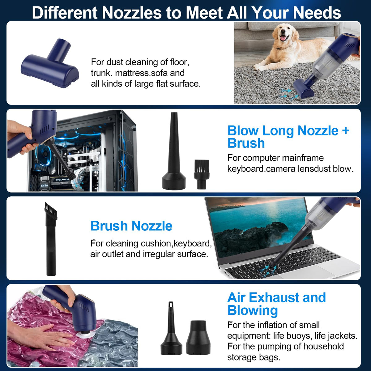 Q: What are the main features of the SUNCANDXY Handheld Vacuum Cordless?A: The SUNCANDXY Handheld Vacuum Cordless features a 3-in-1 design that includes vacuuming, blowing, and pumping functions. It comes with 5 specialized nozzles for versatile cleaning in hard-to-reach areas and larger surfaces. With fast Type-C charging and a powerful 4000mAh battery, it provides 18 to 30 minutes of usage time.