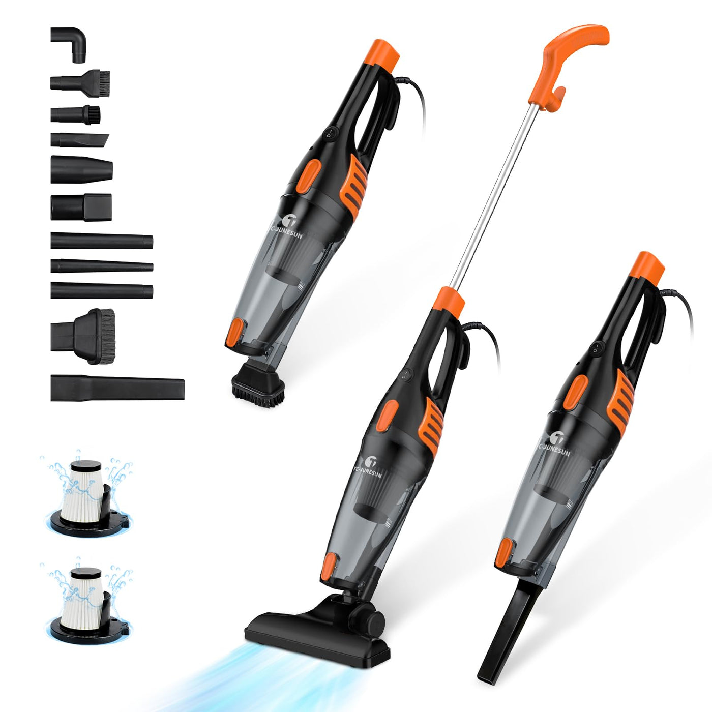 TC-JUNESUN Corded Stick Vacuum Cleaner - Powerful Suction and Lightweight Vacuum Cleaners for HomeOur multifunction vacuum cleaner can help you easily cleaning out different kinds of trash, such as pet hair, dusts, snack crumbs,coffee beans and cat litters.? SpecificationWattage: 400WVoltage: 120VWire length: 16.4 ft (5 M)Dirt cup: 1LDust Collection: BaglessColor: Orange BlackModel: 1702 Corded Vacuum Cleaner? Super Lightweight DesignPerfect for carrying up and down stairs or above floor cleaning. TC-JUNESUN corded stick vacuum cleaner is under 3.3 lbs!? Convenient for Corners CleaningThe portable vacuum with cord can be used between 0-90 to easily clean the bottom of sofa or bed.? No-Touch Bin EmptyingThe 1L dust cup has a one-touch emptying function and is removable and washable.? Convert to Hand VacClean tight spaces, upholstery, and more with the versatile detachable hand vacuum.? Winding Power CordStands upright on its own and the cord wraps conveniently around hooks on the back to keep everything organized.Whats in Box?1 x Corded Vacuum Cleaner2 x HEPA filter (1pc ins9talled, 1pcs for replacement)3 x Crevice Tool3 x Dusting Brush5x Round Crevice Tools1 x User Manual? Cleaning and MaintenanceClean dust cup1.One-Click Easy Empty2.Remove the dust cup3.Remove HEPA4.Wash it if necessary5.Mark sure the cup is dry before installation? Clean HEPA Filter1.Gently knock the dust out off the HEPA filter2.Wash it gently with only water if necessary, not with a brush in order to protect is filter materialAttention:Make sure the filter is dry (air dry only) before installationClean sponge pad (Which is right below air inlet of the cleaner)