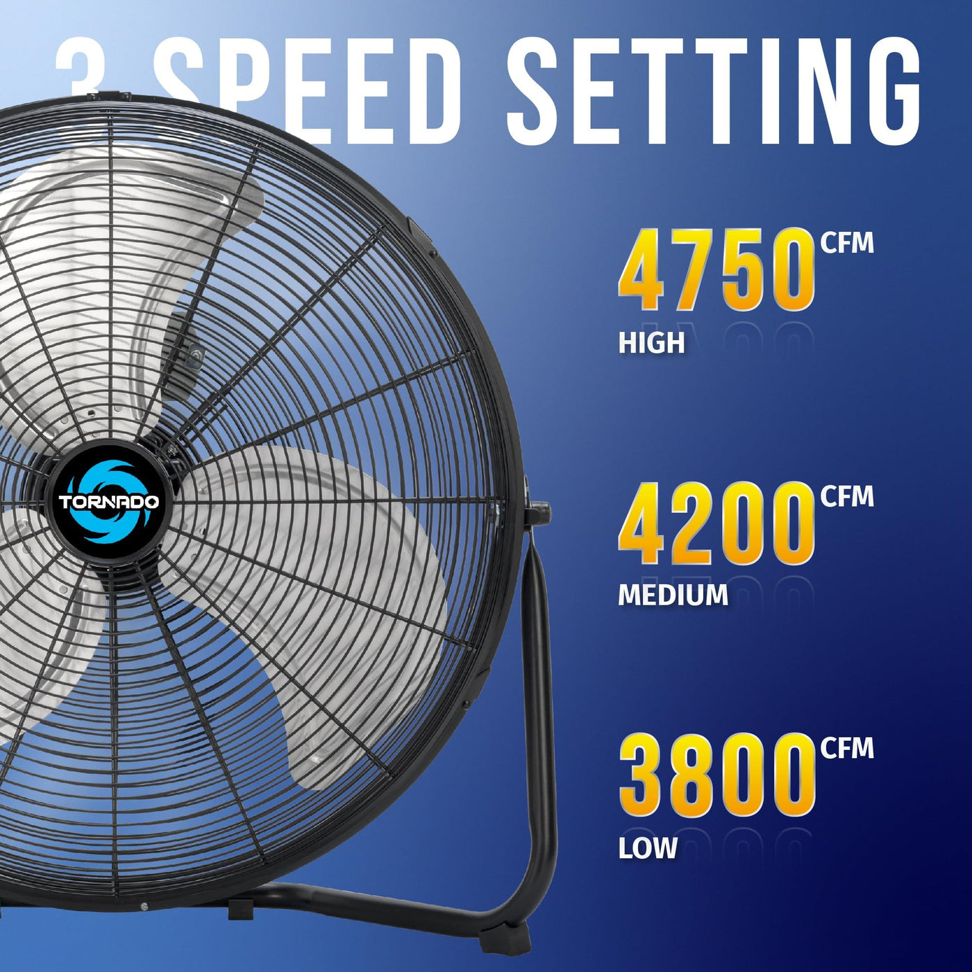 Q: What are the speed options available for the Tornado 20 Inch Industrial Metal Floor Fan?A: The Tornado 20 Inch Industrial Metal Floor Fan features three adjustable speeds, allowing you to select between airflow rates of 4750, 4200, and 3800 CFM for customized cooling comfort.