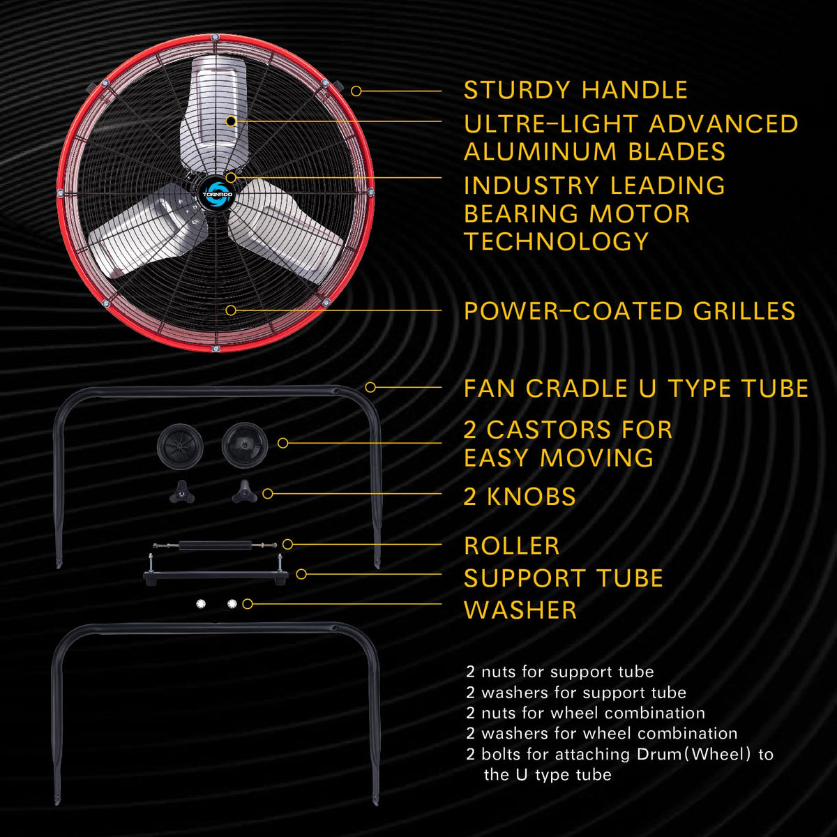 Q: What are the main features of the Tornado 24 Inch High Velocity Heavy Duty Tilt Metal Drum Fan?A: The Tornado 24 Inch High Velocity Heavy Duty Tilt Metal Drum Fan features a durable aluminum and powder-coated steel construction, rust-resistant grille, and three aluminum propellers. It offers a powerful airflow of 8800 CFM with three speed settings, a 360-degree tilt capability, and an extra-long 8 FT power cord.