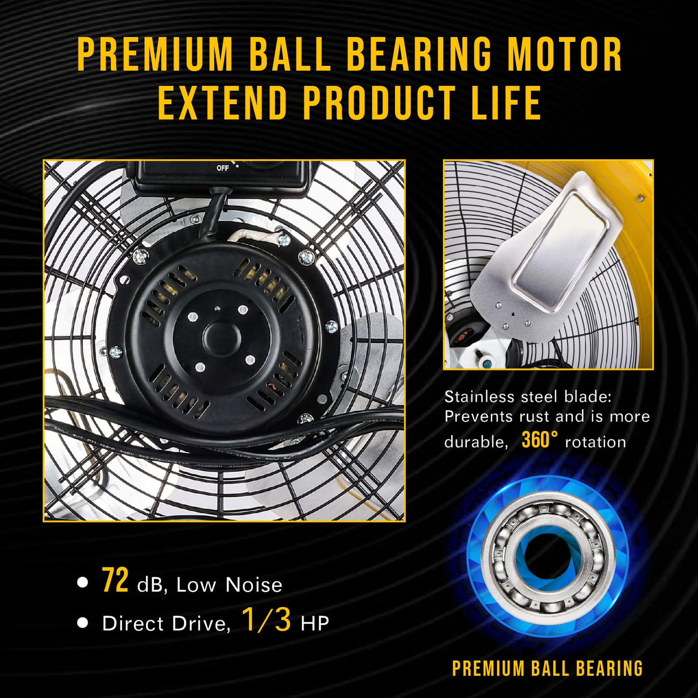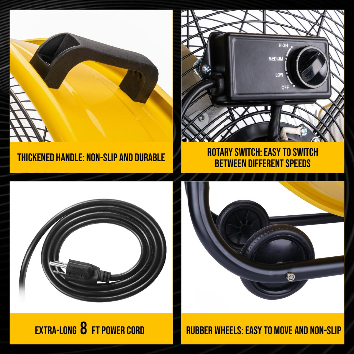 Tornado 24 Inch High Velocity Heavy Duty Tilt Metal Drum Fan Yellow Commercial, Industrial Use 3 Speed 8540 Cfm 1/3 Hp 8 Ft Co