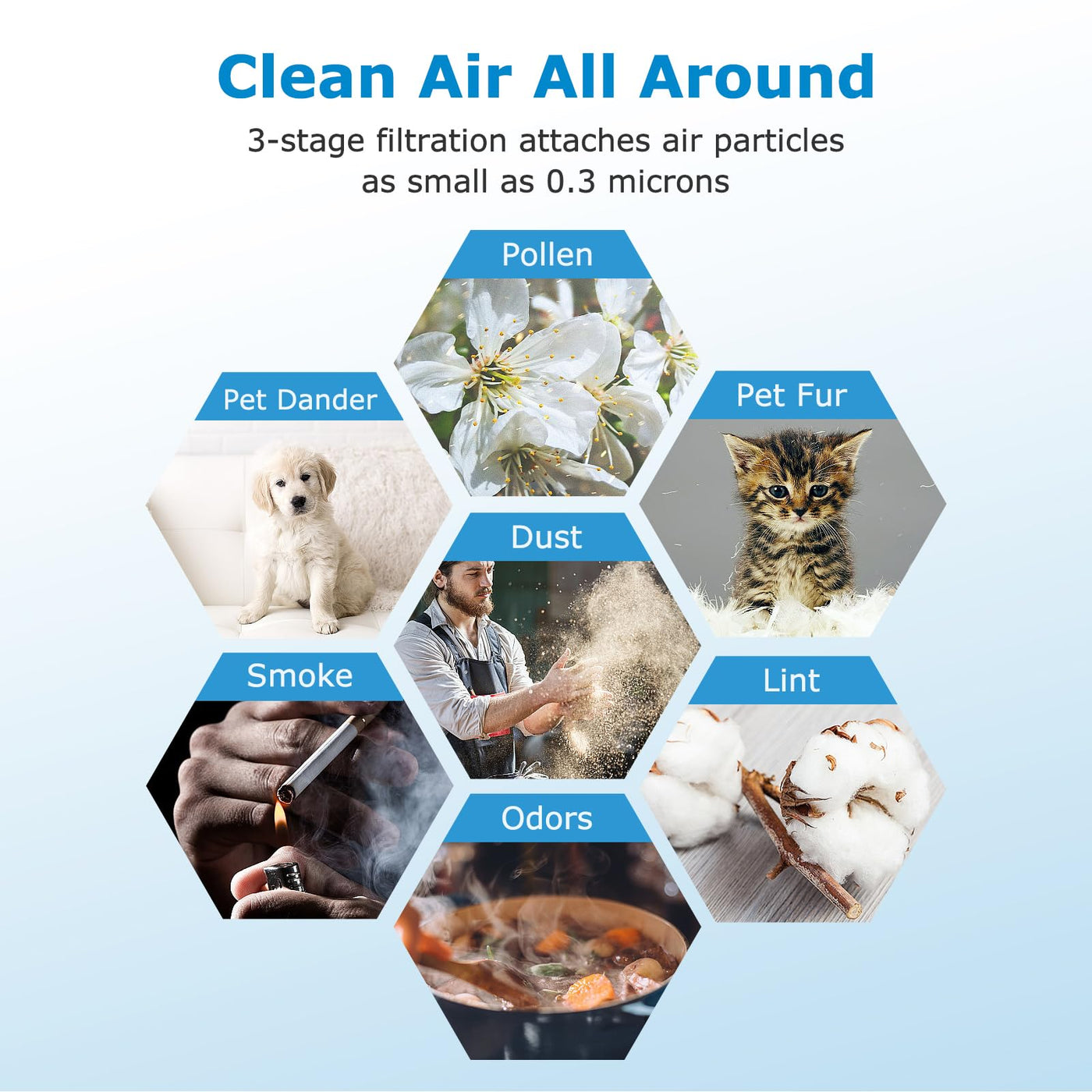 Q: What types of particles can the H13 grade HEPA filter capture?A: The H13 grade True HEPA filter in the TT-AP002 is designed to capture nearly all airborne particles as small as 0.3 microns, including pet dander, dust, pollen, smoke, and VOCs, helping to improve your indoor air quality.