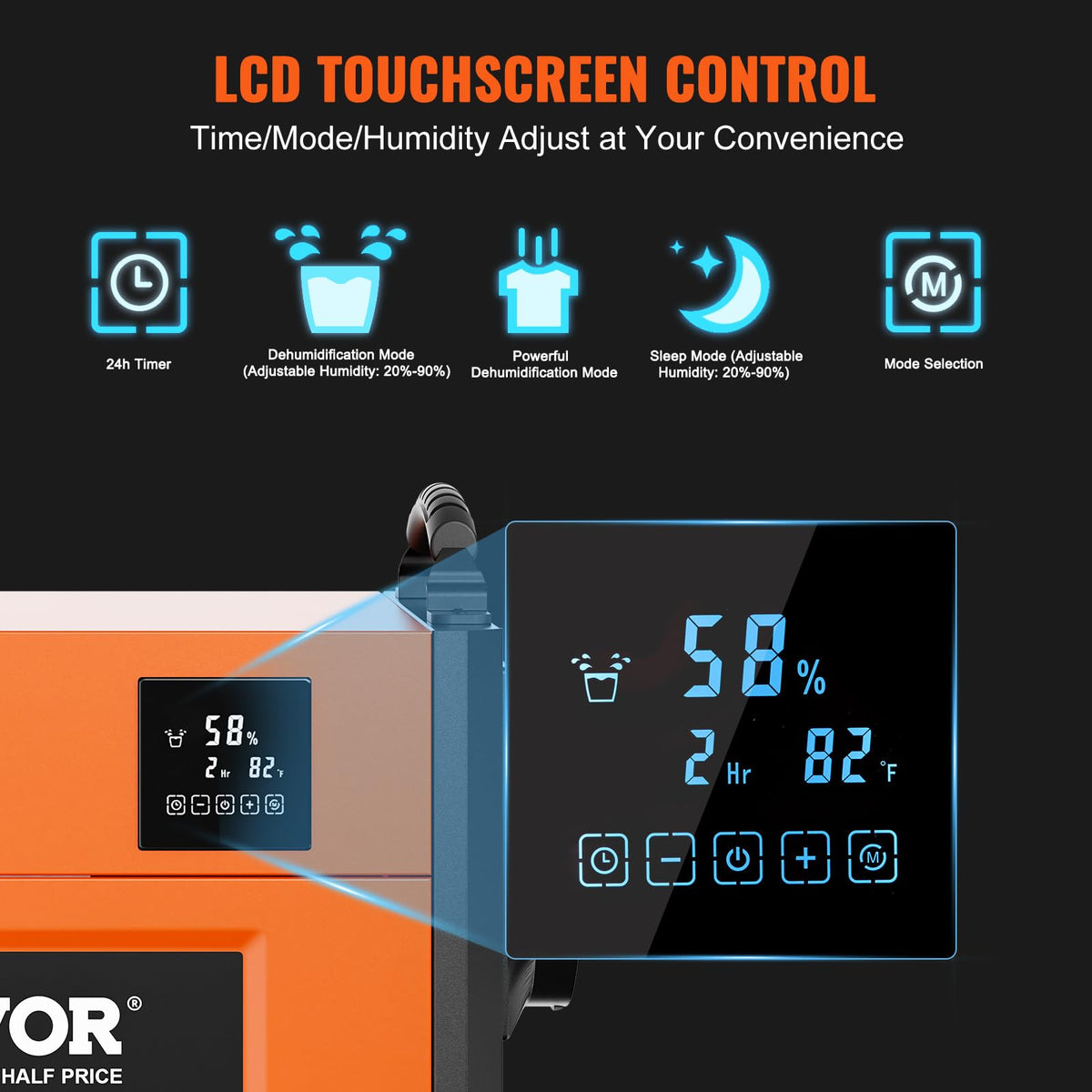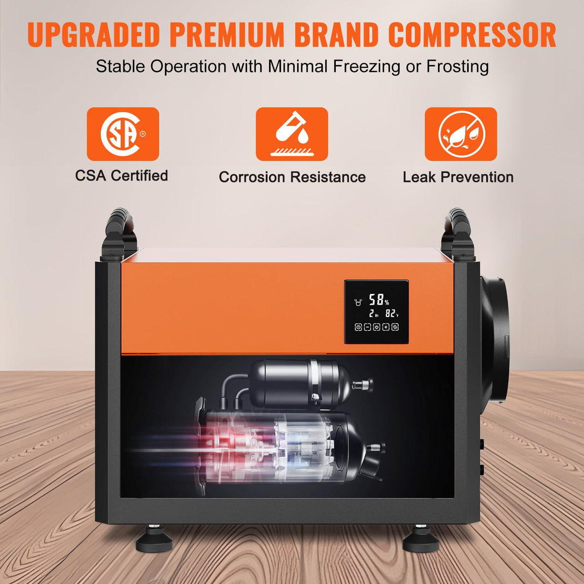 Efficient Dehumidification: Vevor Commercial Dehumidifier Can Remove 125 Pints At Saturation, 60 Pints Per Day At Aham, The Airflow Intensity Is 210 Cfm, Which Can Efficiently Dehumidifies Up To 1,300 Square Feet. Suitable For Use In Home Living Rooms, Basements, Crawl Spaces, Laundry Rooms, Garages, Storage Rooms, And More. | Safety And Stability Performance: This High-Quality Dehumidifier Uses Leading Brand Compressors And Copper Tube Condensers, Which Are Corrosion-Resistant And Leak-Proof. When A Defrost Signal Is Detected, An Automatic Defrost Cycle Is Run To Avoid Frost Build-Up And Related Problems. Csa Safety Certification Ensures Product Performance And Safety. | Convenient Operation: Vevor Dehumidifier Feature Lcd Display For Easy Settings Adjustment, Including A 24-Hour Timer And Memory Function. Offers Automatic Dehumidification, Continuous High-Power Dehumidification, And Sleep Mode. 3-Speed Options And Customizable Humidity Settings For User Convenience. | Easy Installation: Securely Install The Product Using Screws For The Unit Body And The Air Outlet. Four Bottom Pads Are Included For Stability. Connect A Hose Or Place The Dehumidifier Over A Floor Drain For Hassle-Free Setup. Simple Installation That Can Be Done By One Person. | Designed For The Modern Home: This Dehumidifier Was Designed With The User In Mind, With A Smaller Size, Compact Design And Sturdy Handle That Can Be Easily And Safely Transported From One Job Site To Another, Or Even From Downstairs To Upstairs. With It You Can Easily Maintain A Healthy 45-55% Humidity Range!