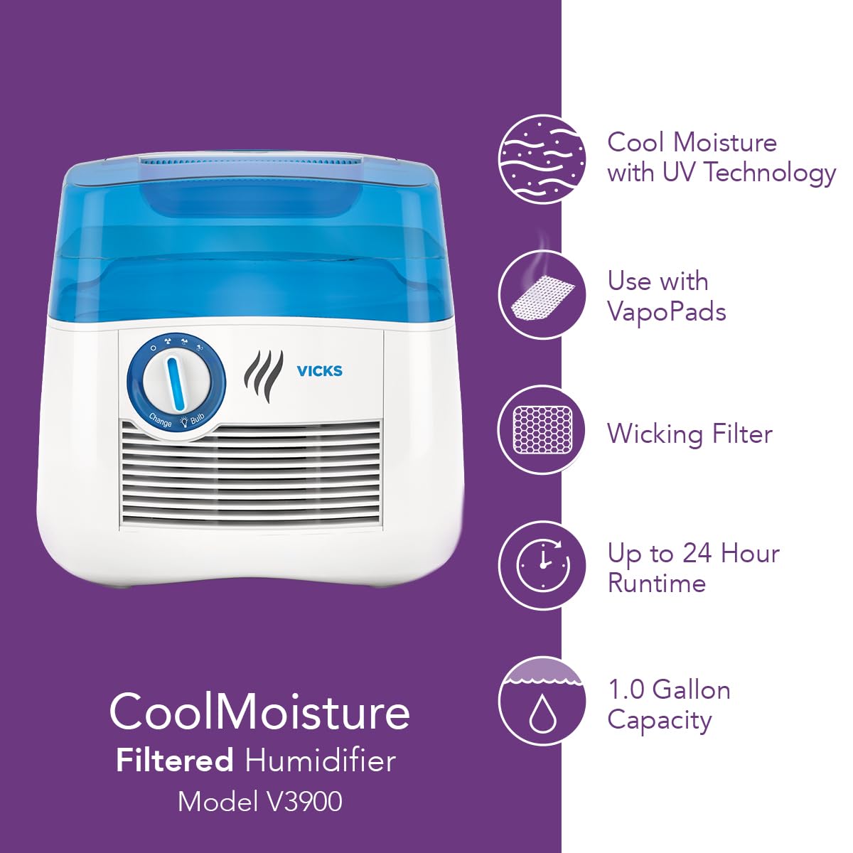 The Vicks Cool Mist Humidifier Helps The User Breathe Better And Sleep More Comfortably For Everyday Comfort. This Cool Mist Humidifier Helps Add Moisture Into The Air. Many Women & Men Find That A Humidifier For The Bedroom Becomes An Essential Part Of A Good Night'S Sleep When The Air Is Dry, In Allergy Season, Or When Sick. Use With Replacement Filter Wf2. *Source: Based On Nielsen Iq Data Xaoc Last 3 Years, 2020-2023, Unit And $ Share.