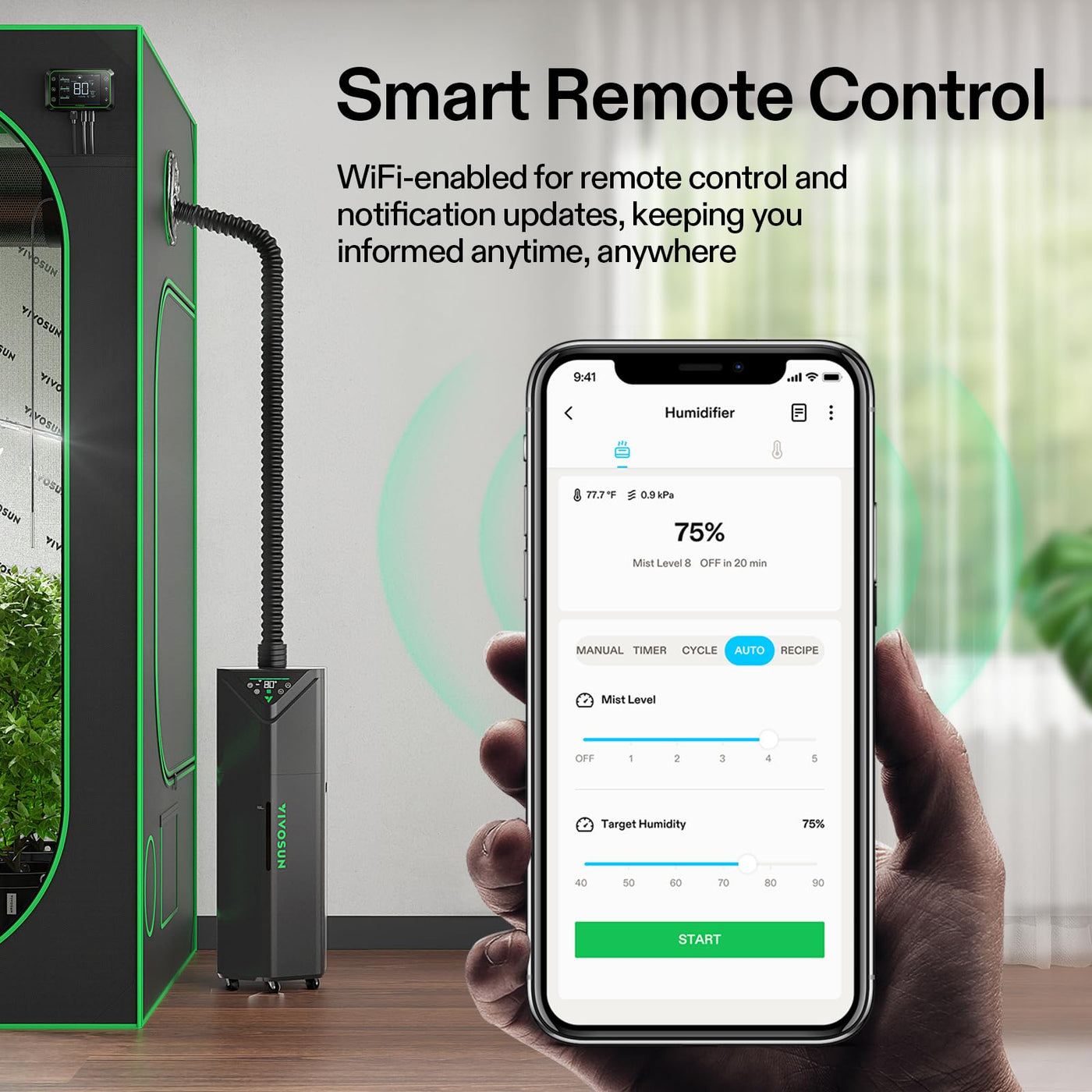 Need A Humidifier For Your Grow Space Or Home? Upgrade Your Environment With Vivosun'S Intelligent Humidifier. Key Features: Our Next-Gen Ultrasonic Atomizer And Fan Deliver Whisper-Quiet, Unparalleled Humidification External Temperature And Humidity Probe Provides Precise, Targeted Environmental Readings 19L Opaque Water Tank Reduces The Need For Frequent Refills A User-Friendly Design Ensures Effortless Operation And Easy Refilling Stay Informed With Smart Remote Control And Notifications Accessible Anytime, Anywhere Intelligent Functions Automatically Maintain Optimal Humidity Levels Includes A Complete Set Of Accessories For Versatile Applications Compact Size Allows For Placement In Most Settings Enhance Your Space With This Humidifier, Creating A Comfortable Living Environment And Ideal Conditions For Your Plants To Thrive.